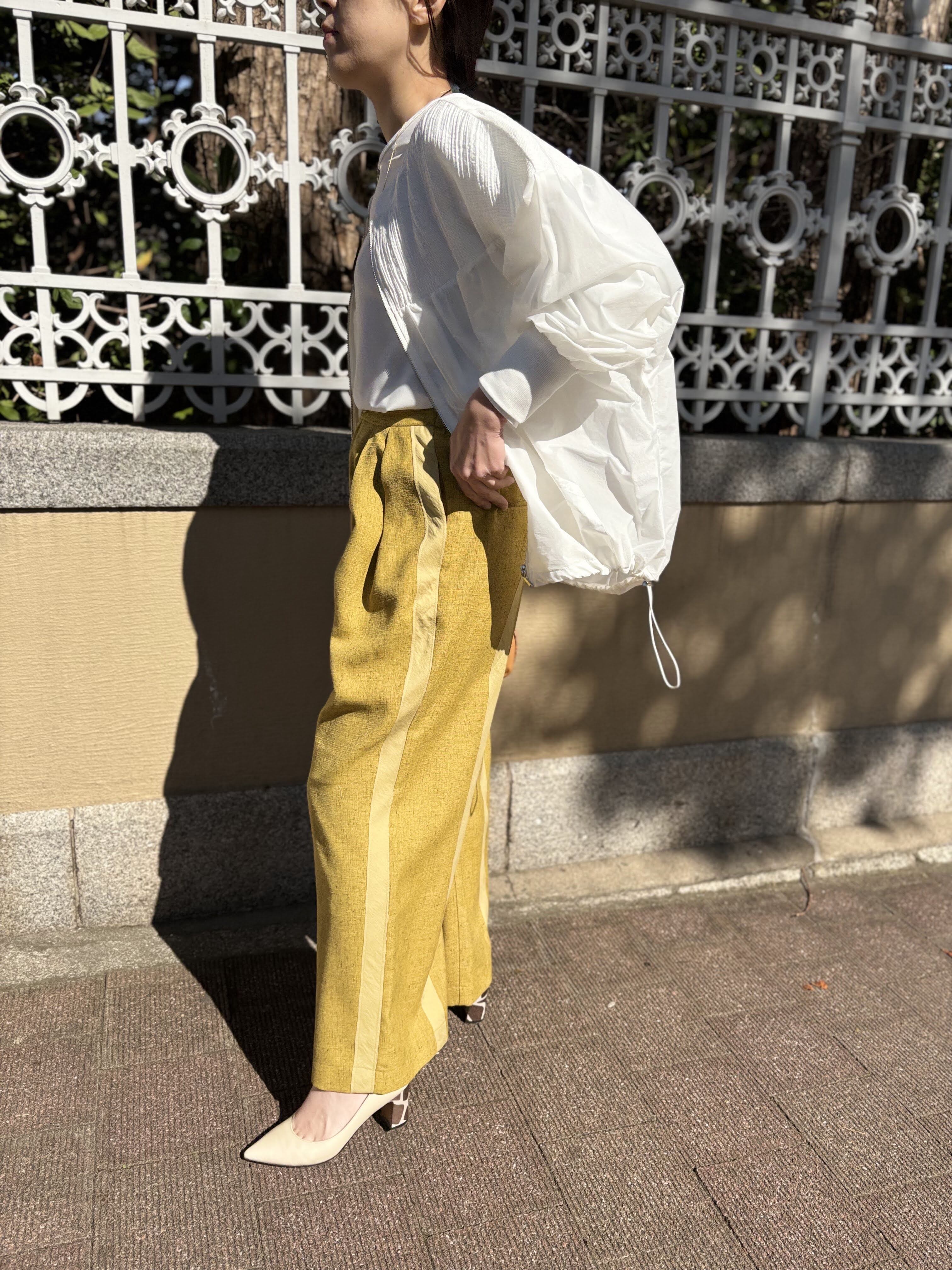 独特なネップ感と、サイドとバックの4本ラインが特徴的なワイドパンツ。このパンツを着るだけで個性的な印象を与えてくれます!