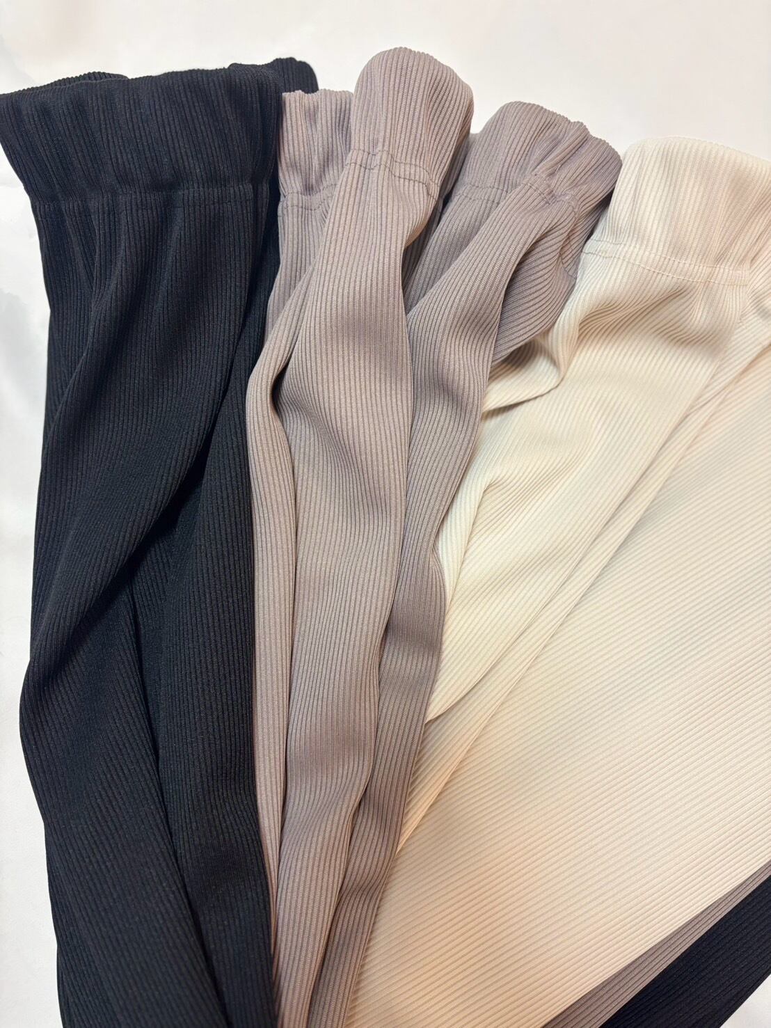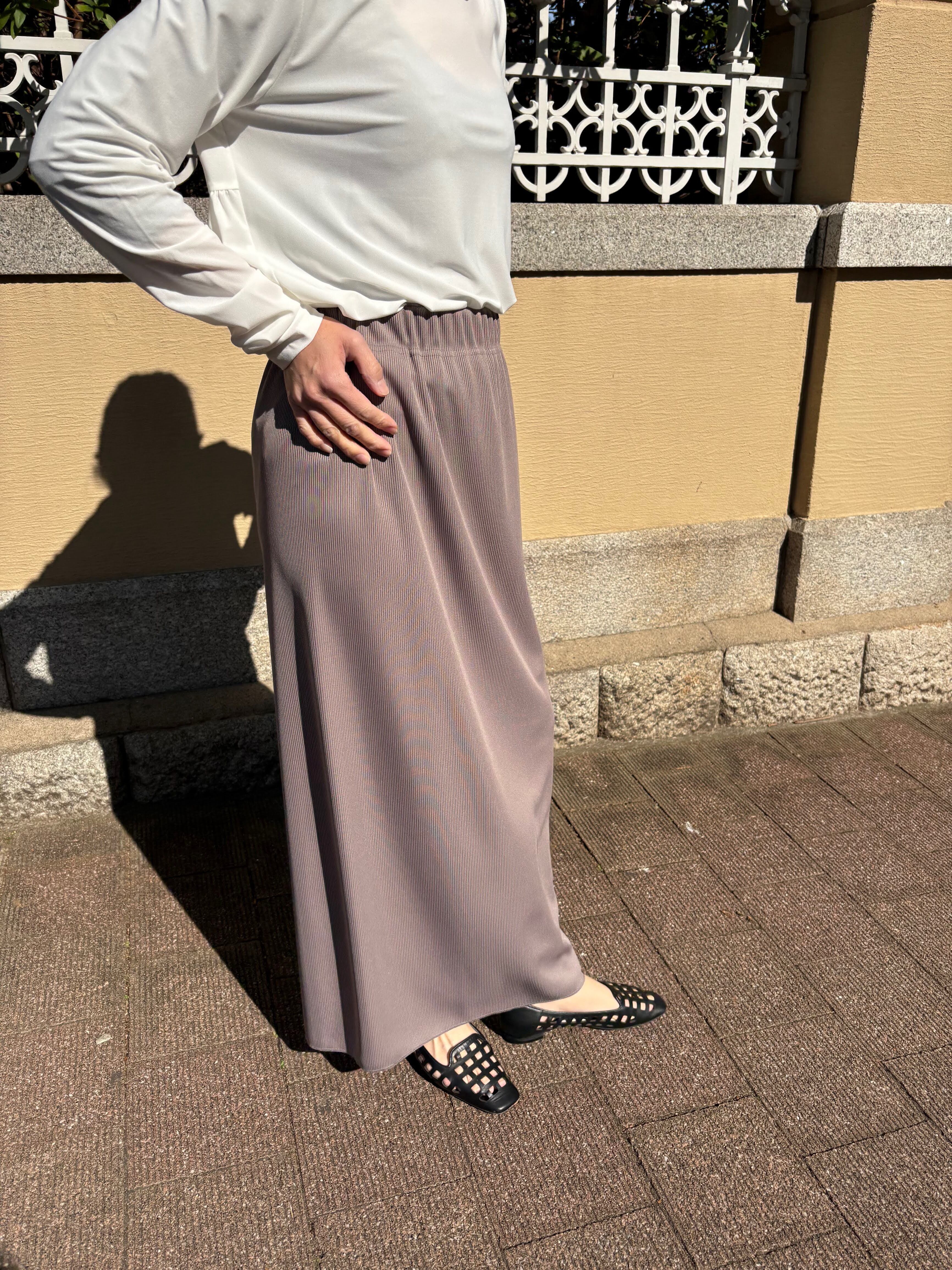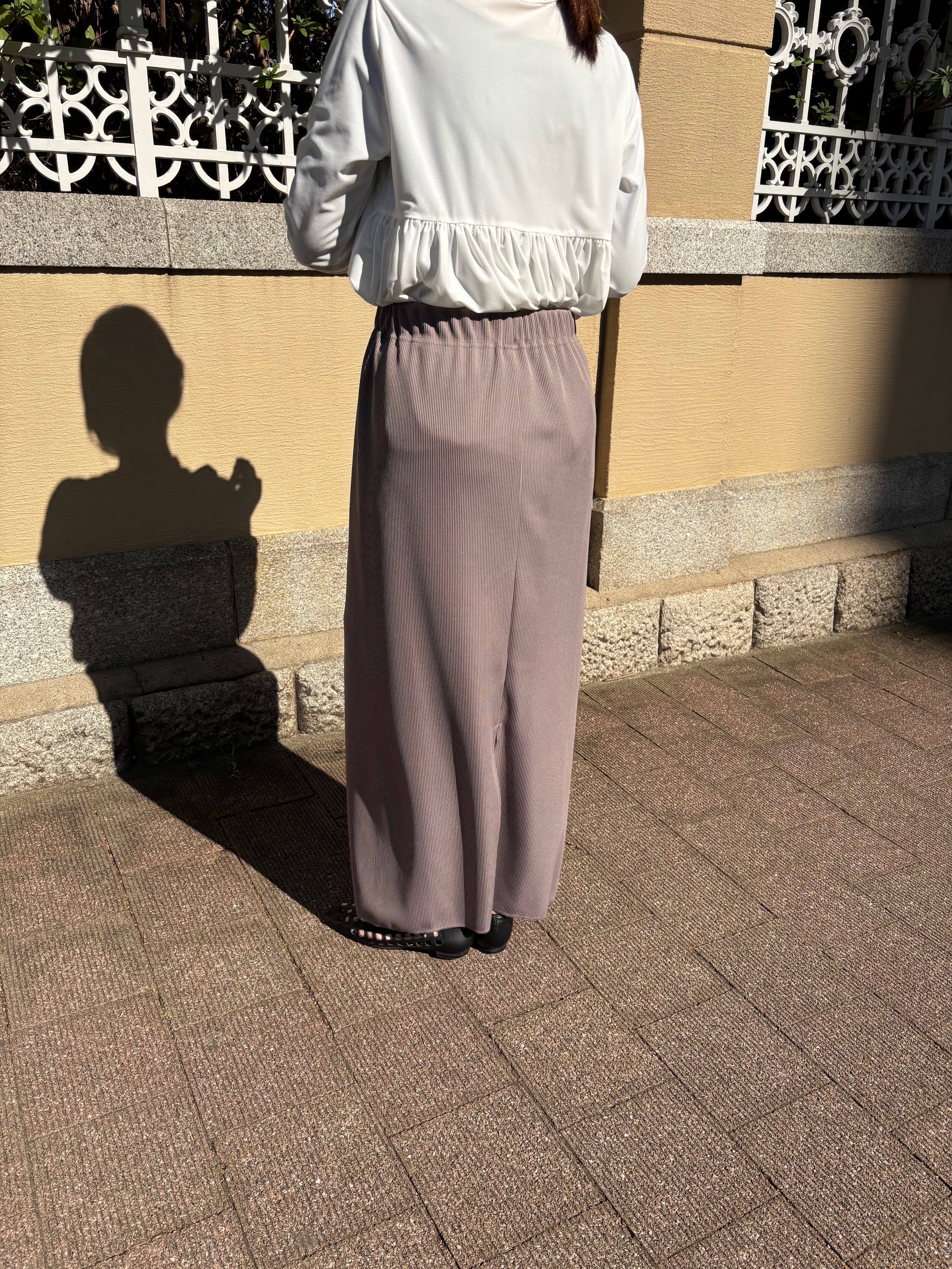 カジュアルからフォーマルまで幅広いコーディネートに対応し、スリムなシルエットが魅力的。体のラインにフィットしながらも、深めのスリットが動きを妨げず、リブ素材の柔らかさが快適な着心地を実現しています。ウエストゴム仕様で脱ぎ着も簡単。シーズン問わず重宝するアイテムです。