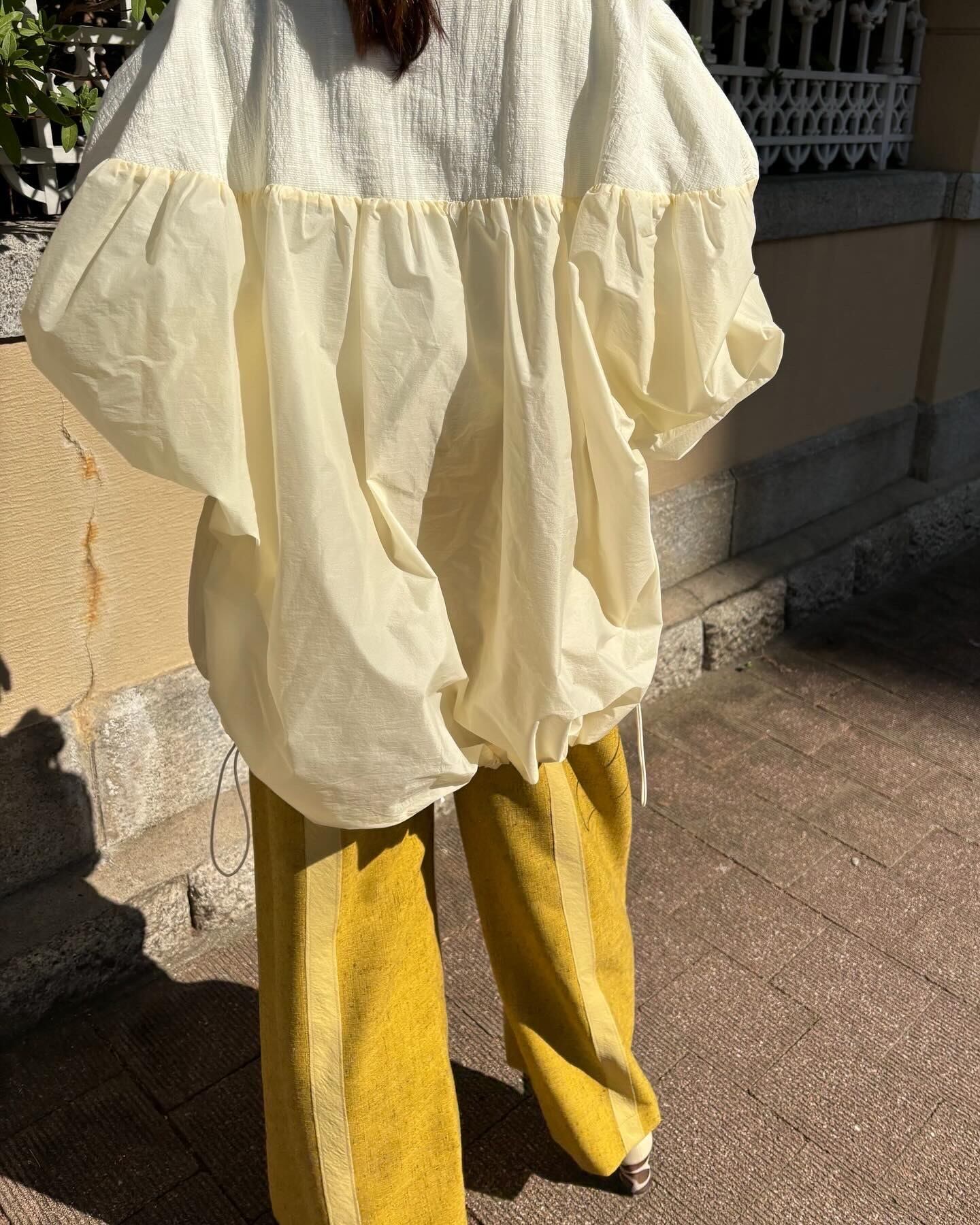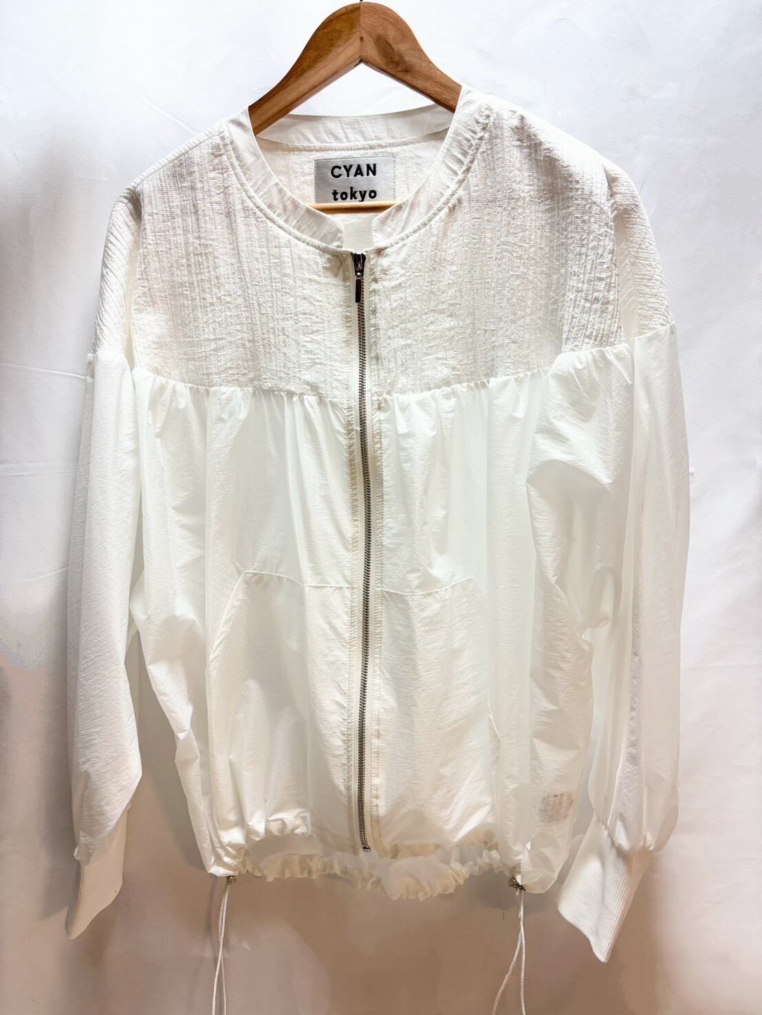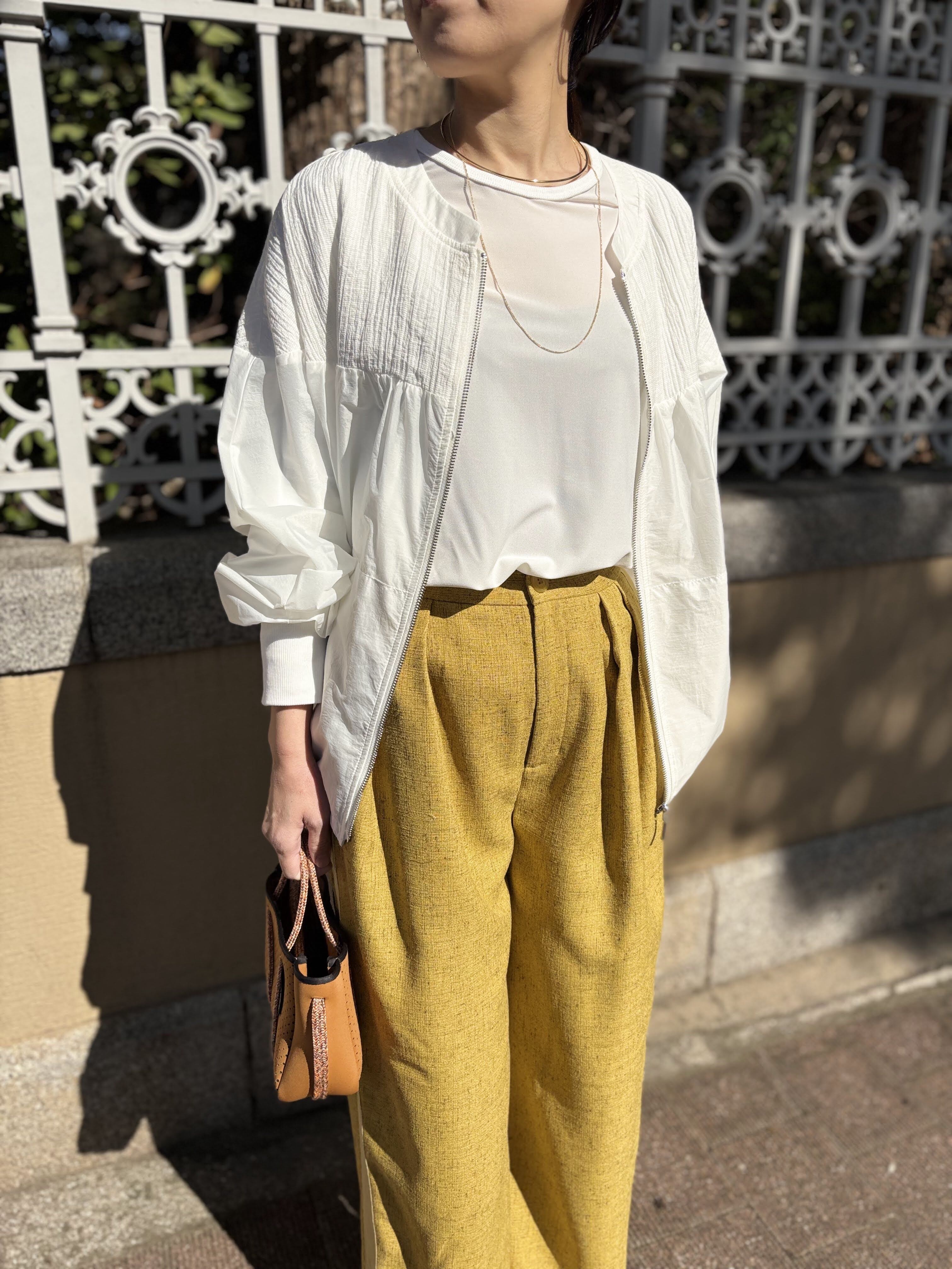 素材切り替えが印象的なシースルーナイロンブルゾン。袖リブと裾のドロストは機能面も良く、旅行の時にも活躍する1枚です。