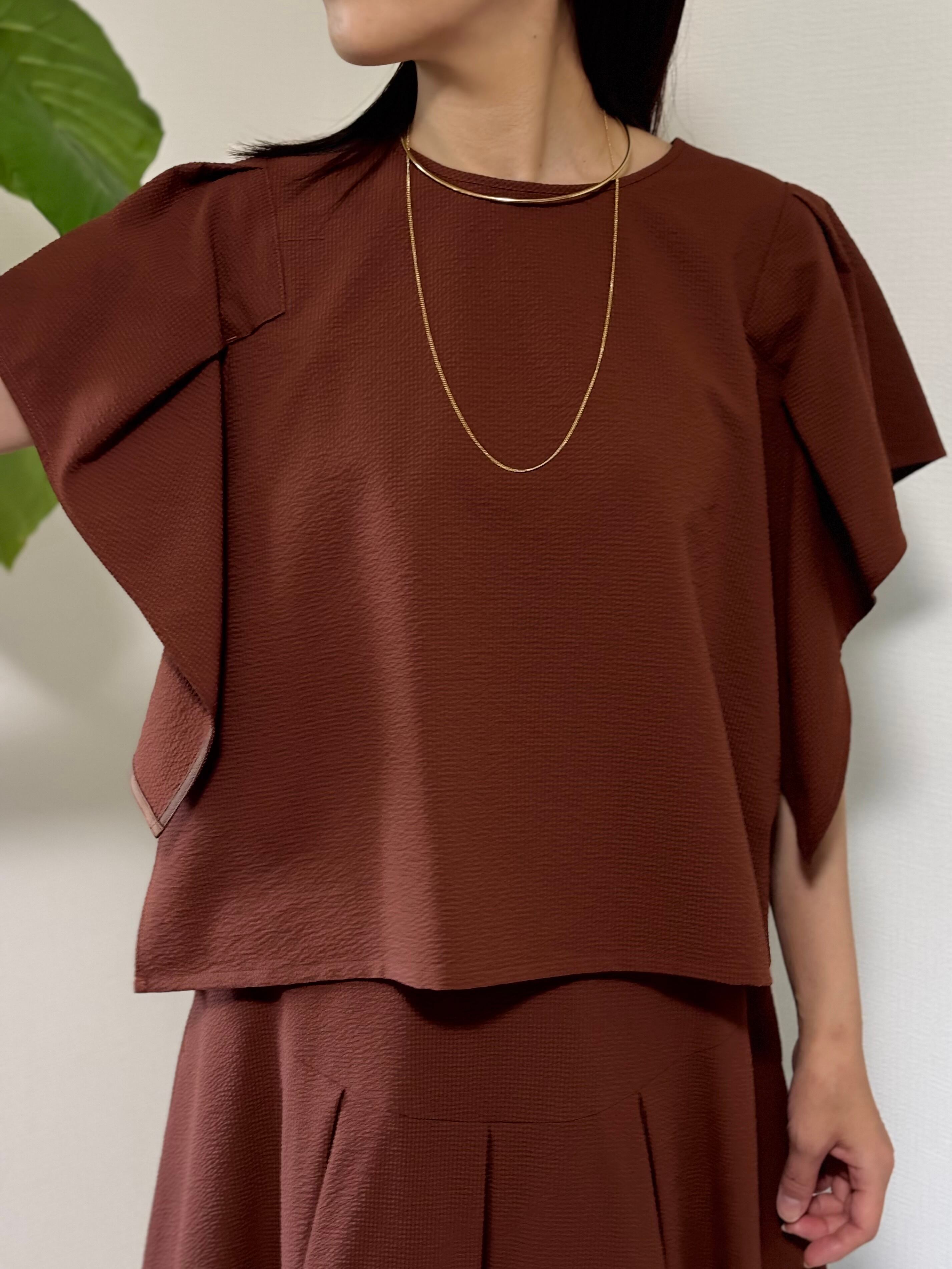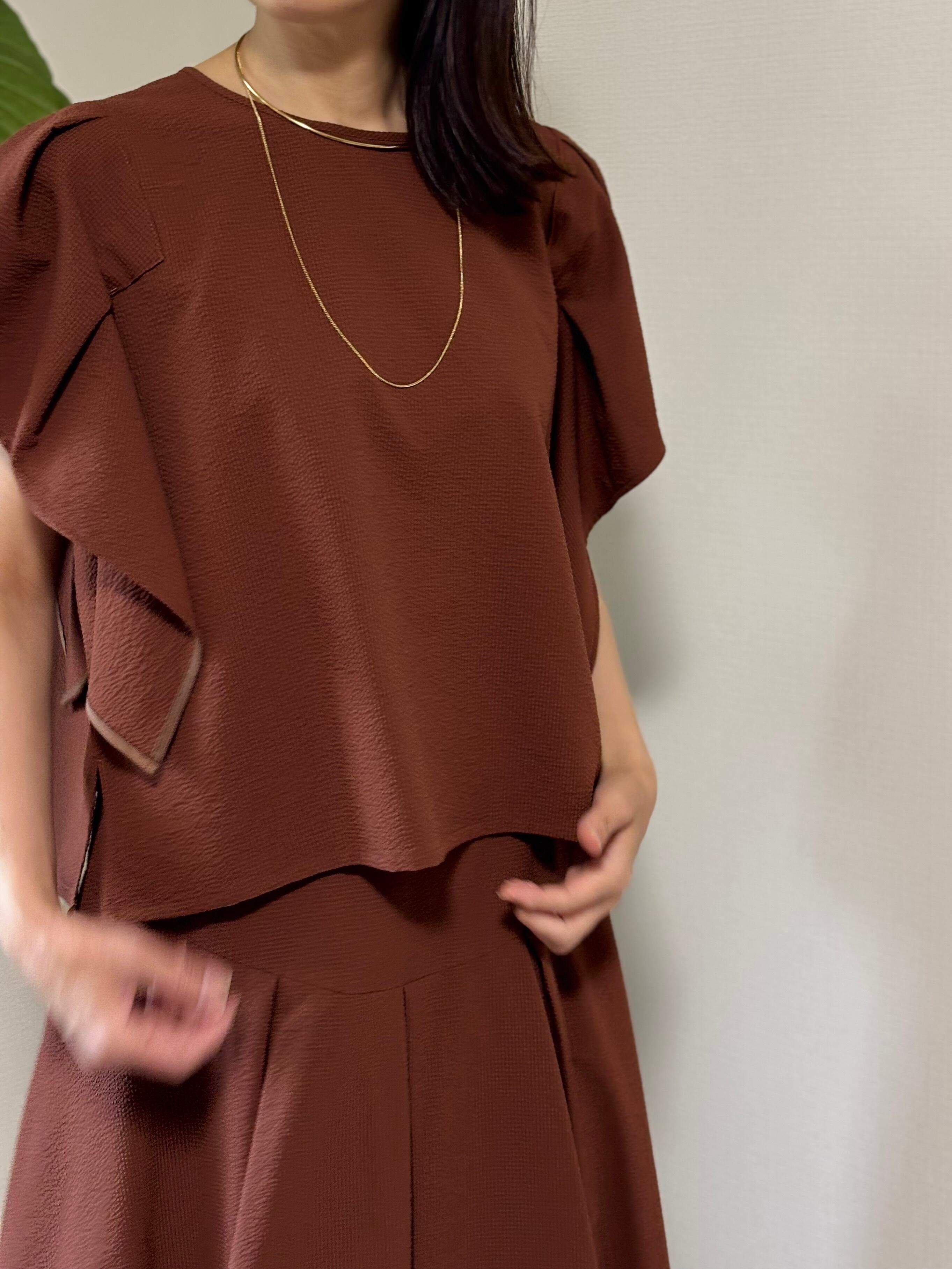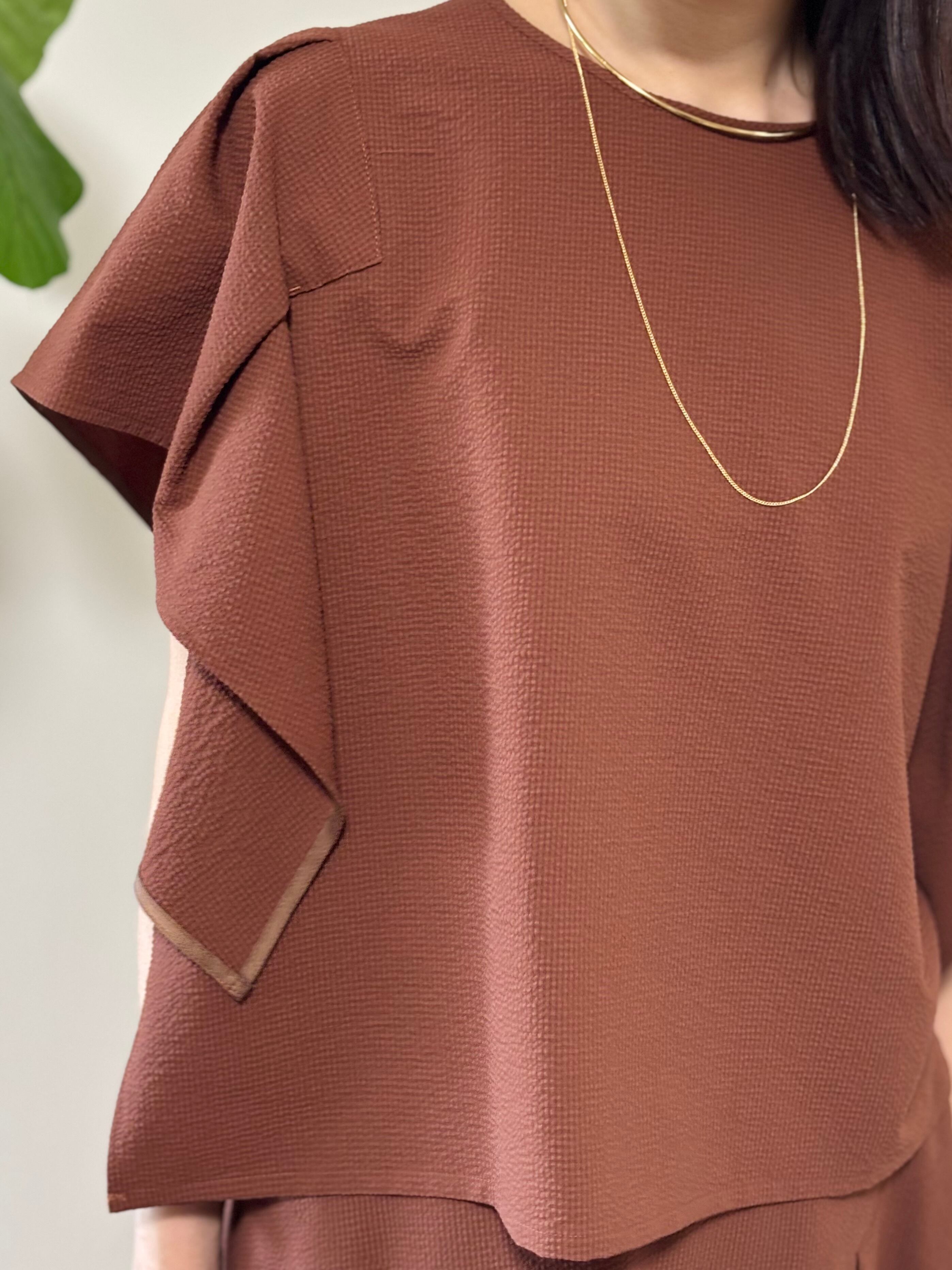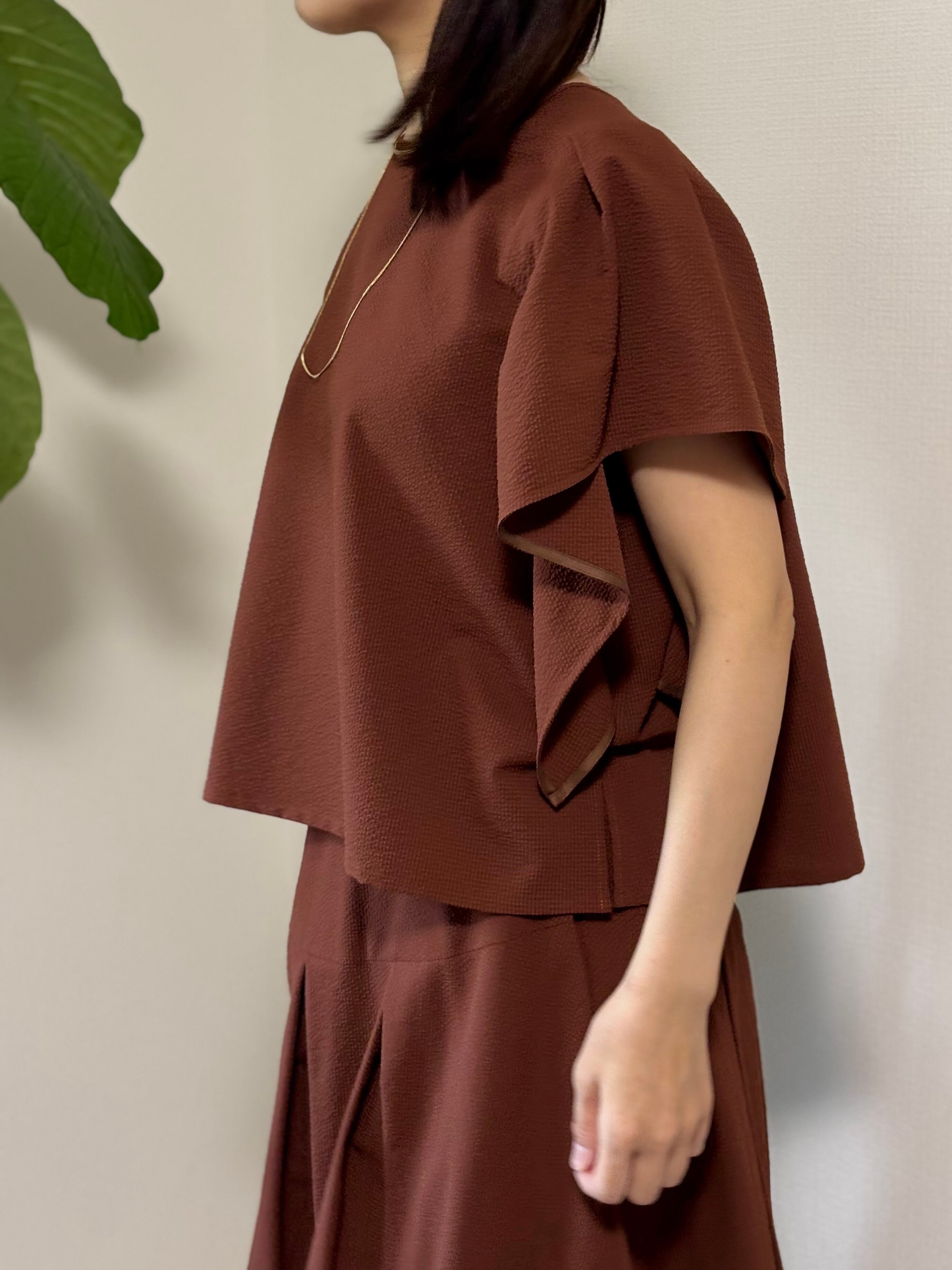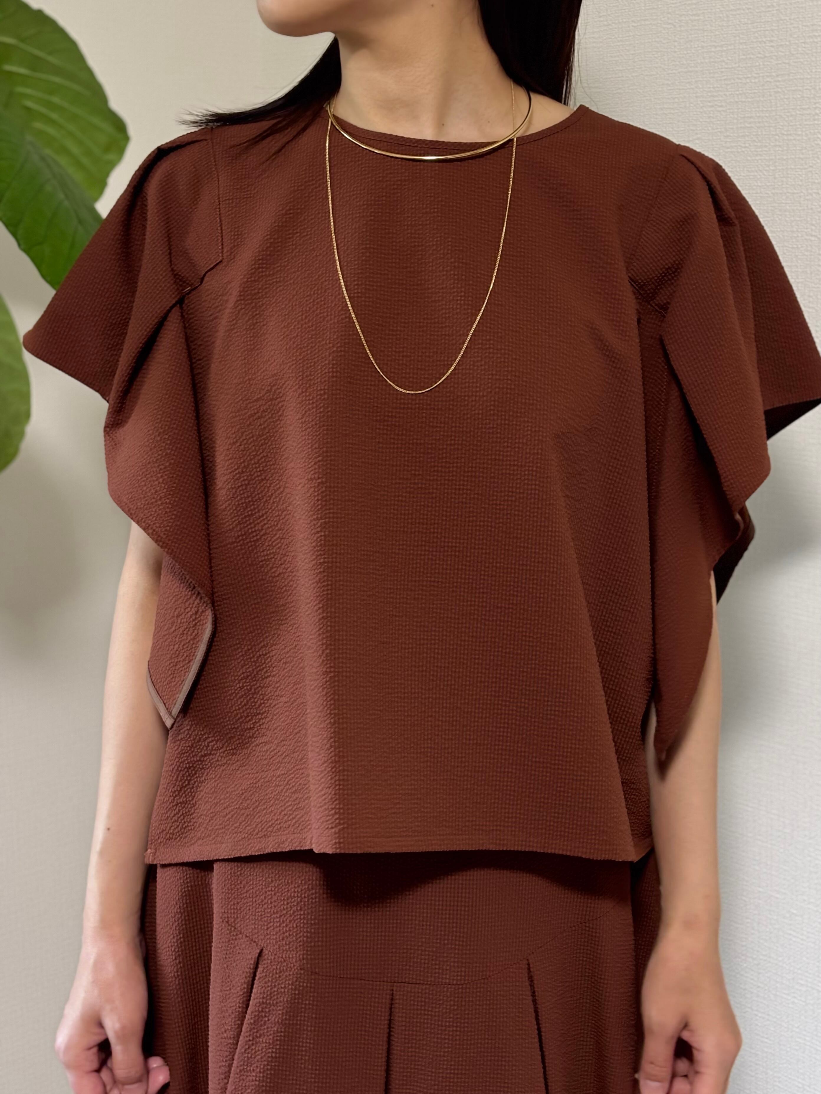袖のフリルデザインが魅力のPASSIONEブラウス。サッカー素材で軽く、涼しく着ていただけます。うでを動かしても、わき部分も見えないはうれしいです。