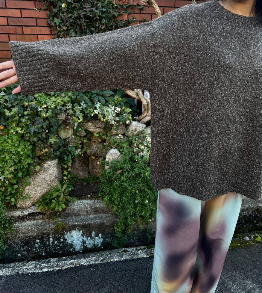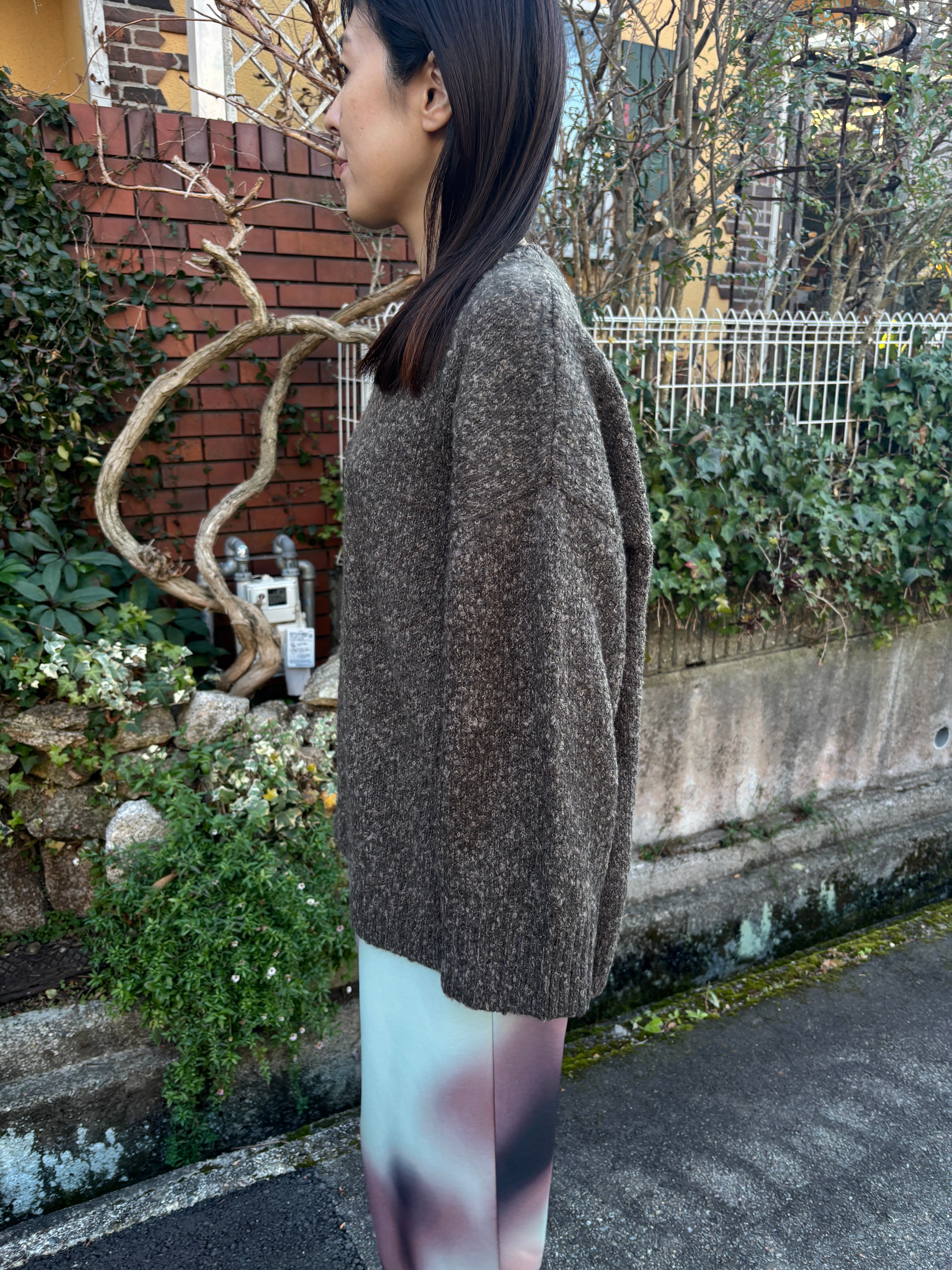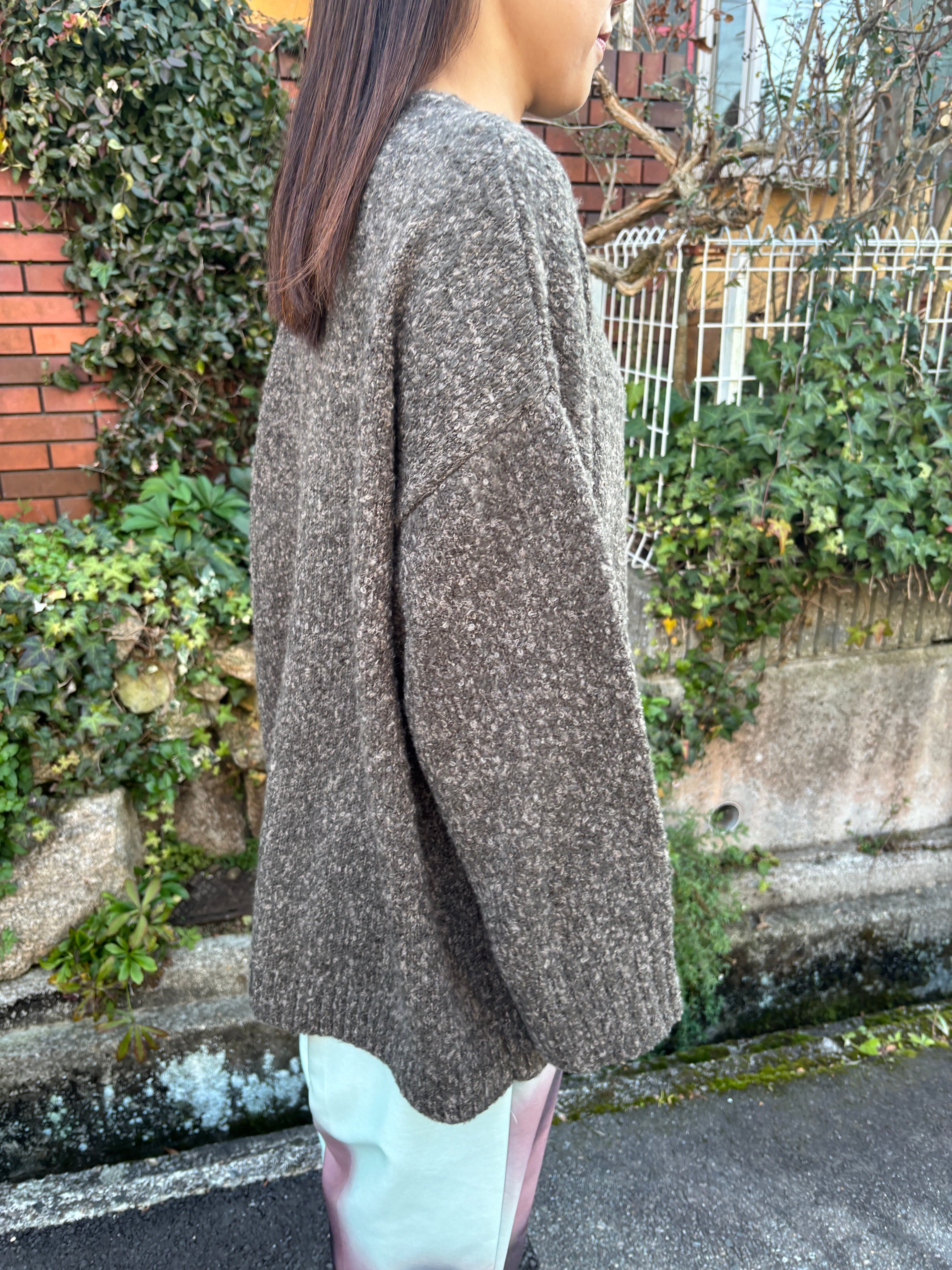 糸はポコポコとした表面感が可愛い、小さいループのブークレを使用したニットプルオーバー。