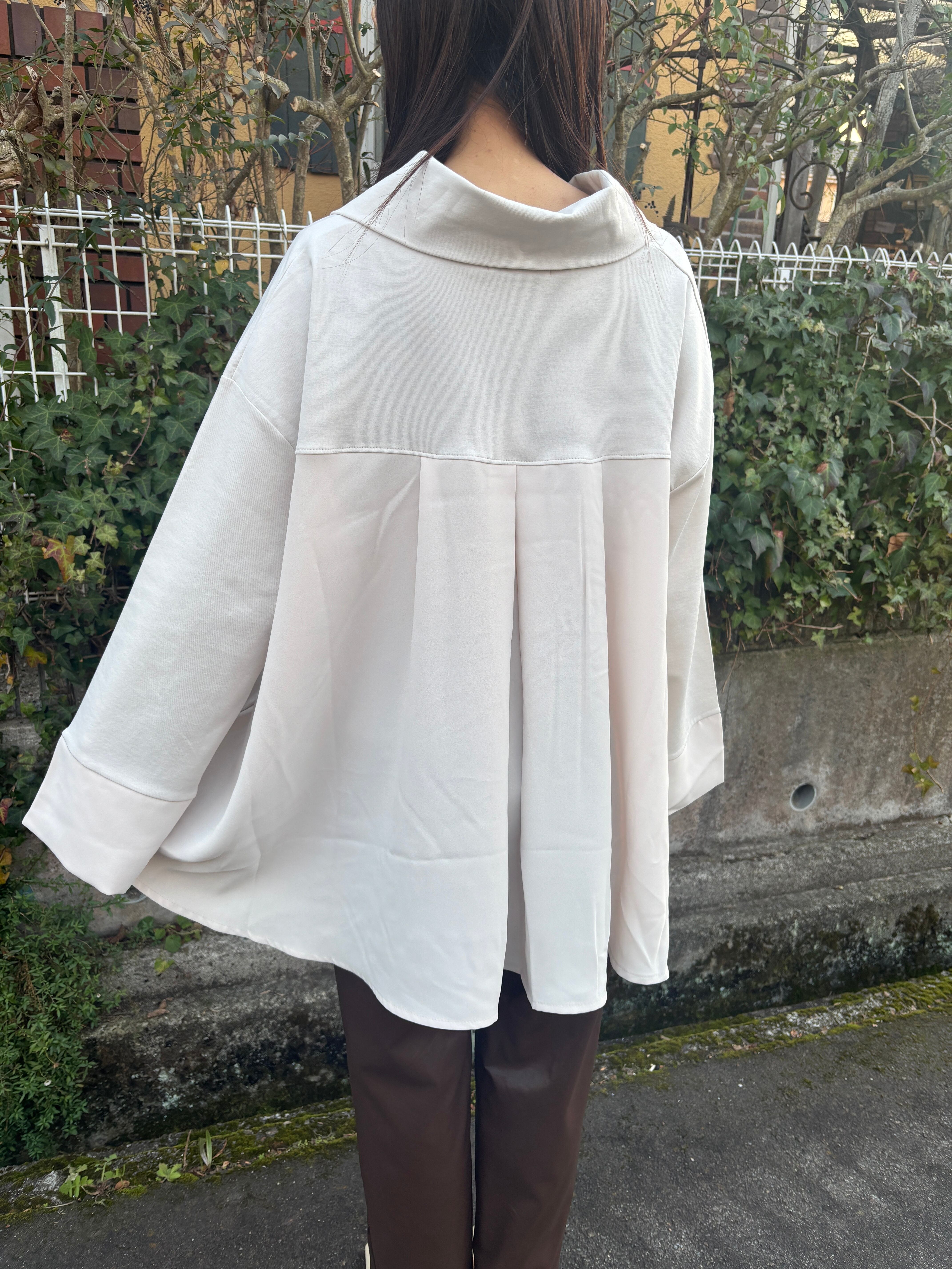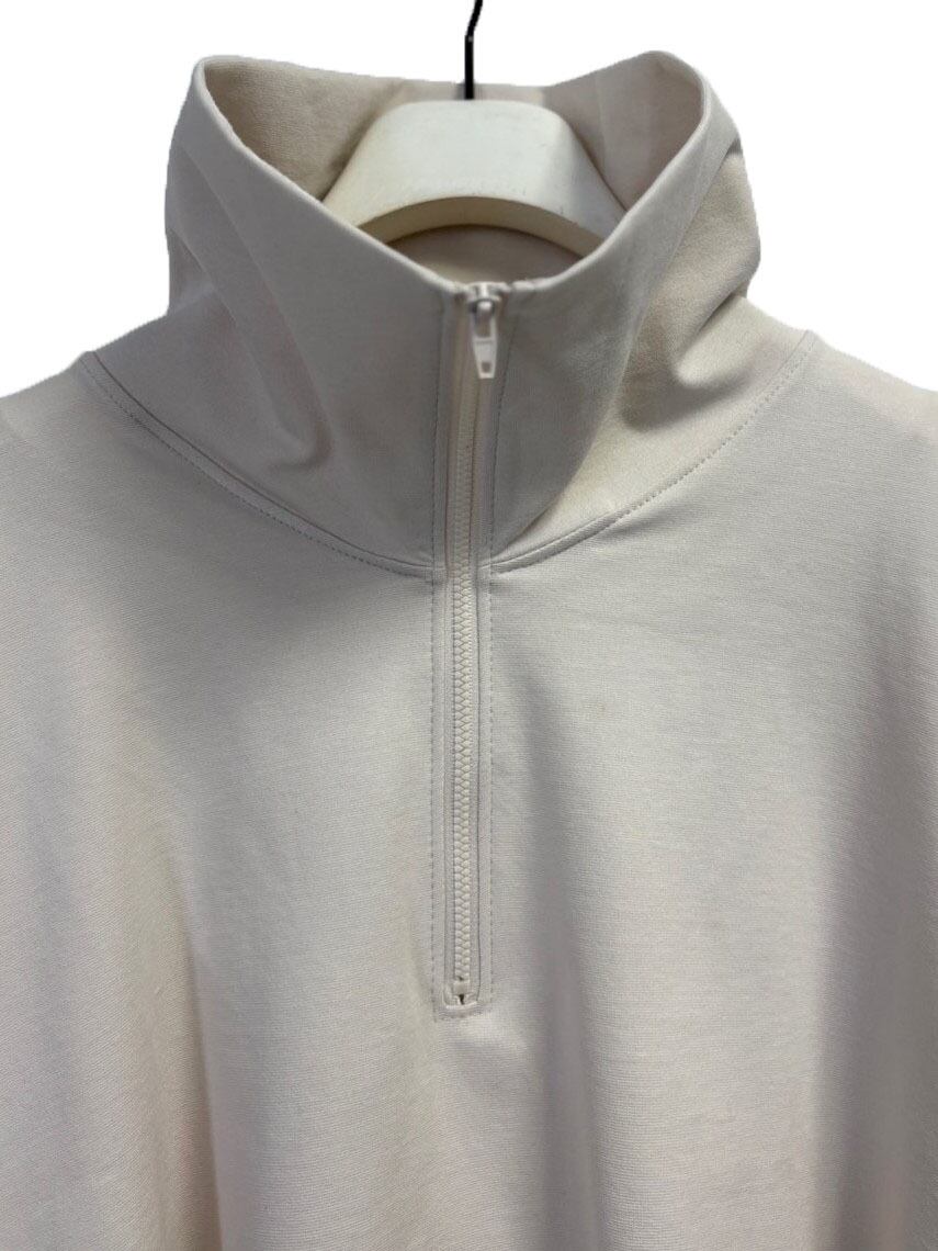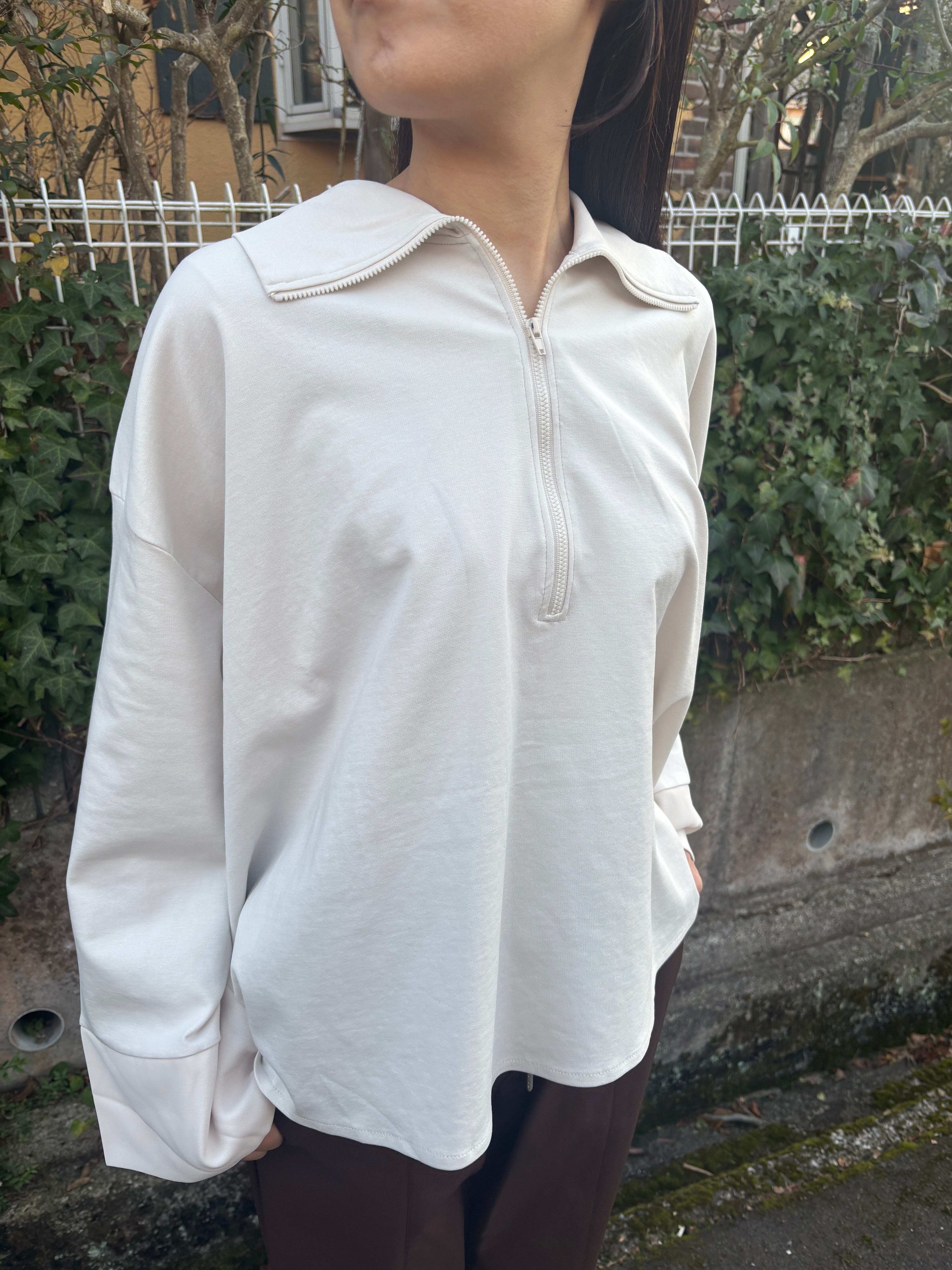 スポーティなZIP使いも、大胆にフレアを入れた身頃と広めの袖口で、フェミニンは要素もある大人なカットソーです。