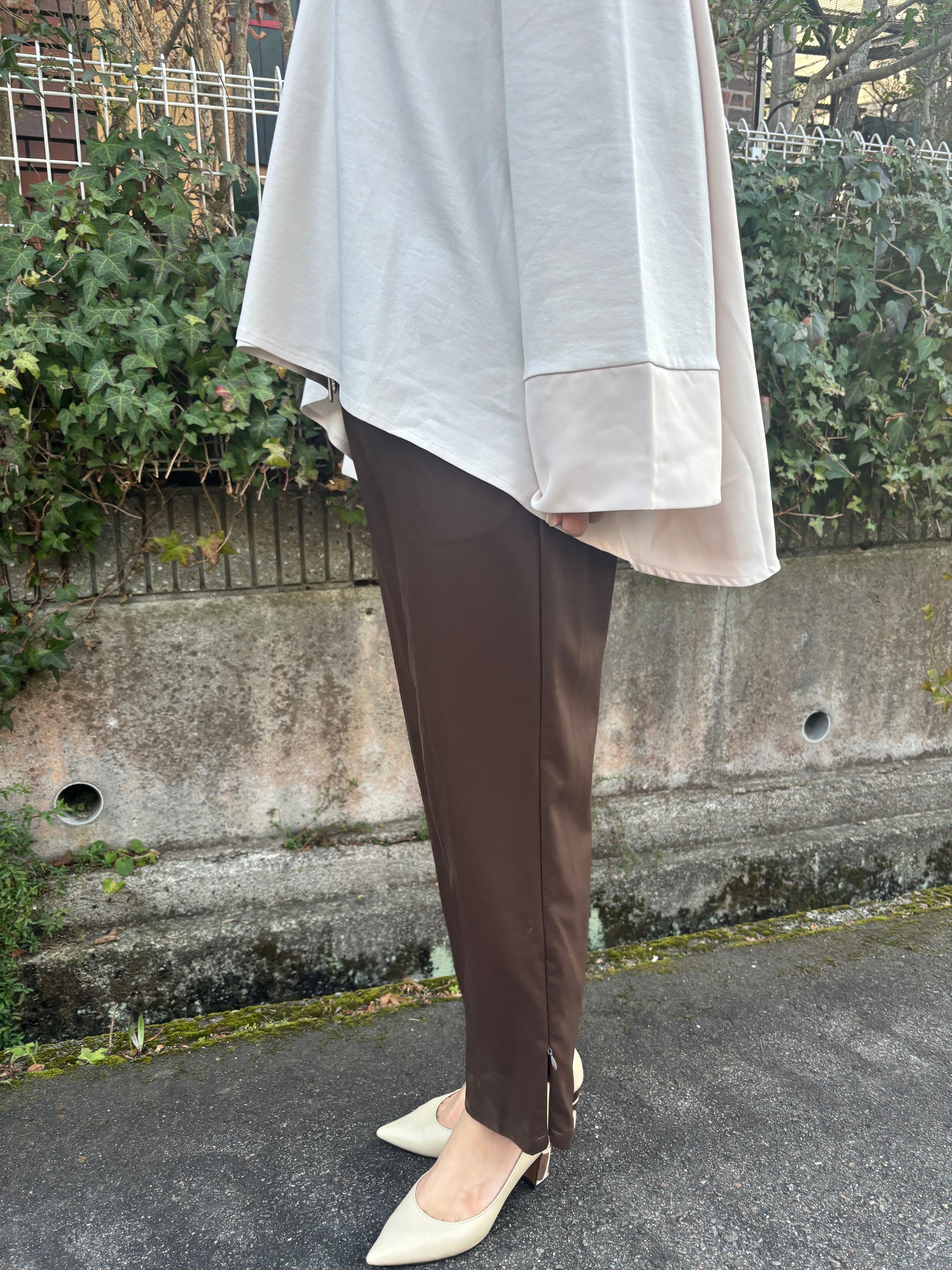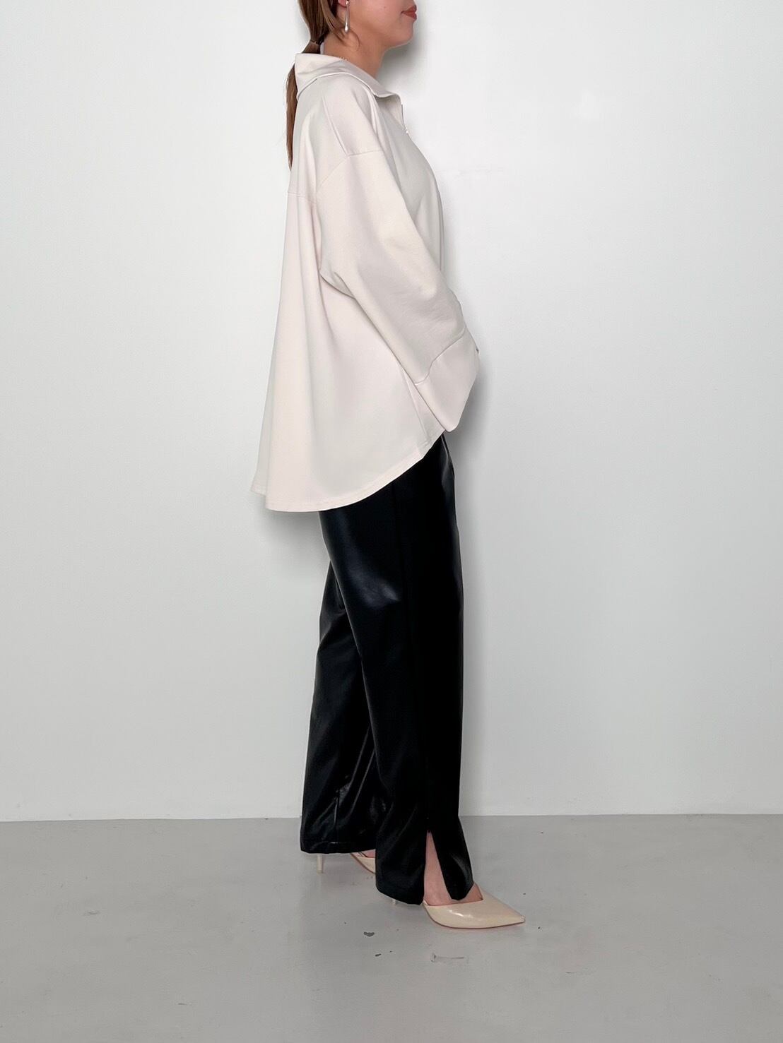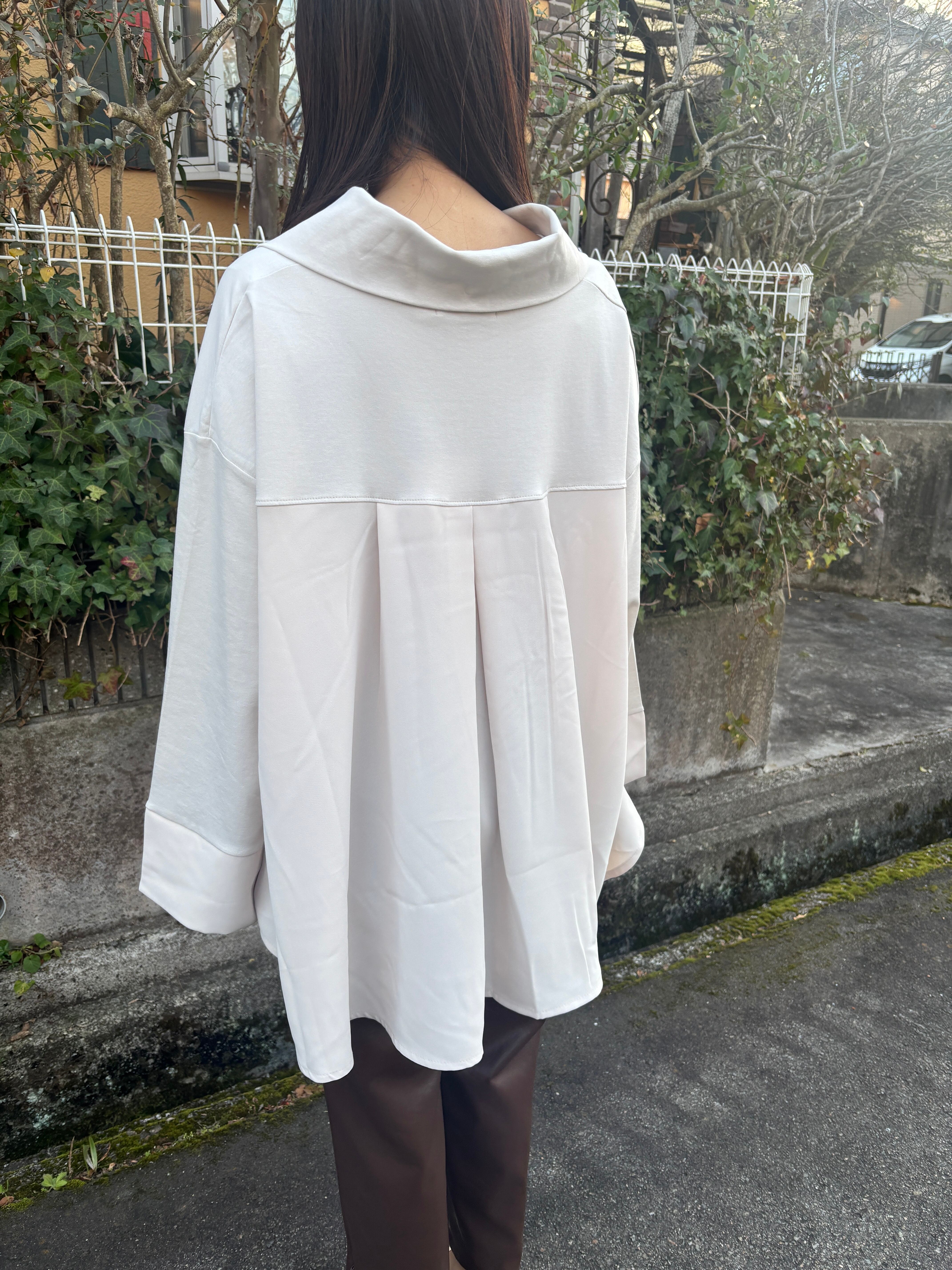 スポーティなZIP使いも、大胆にフレアを入れた身頃と広めの袖口で、フェミニンは要素もある大人なカットソーです。