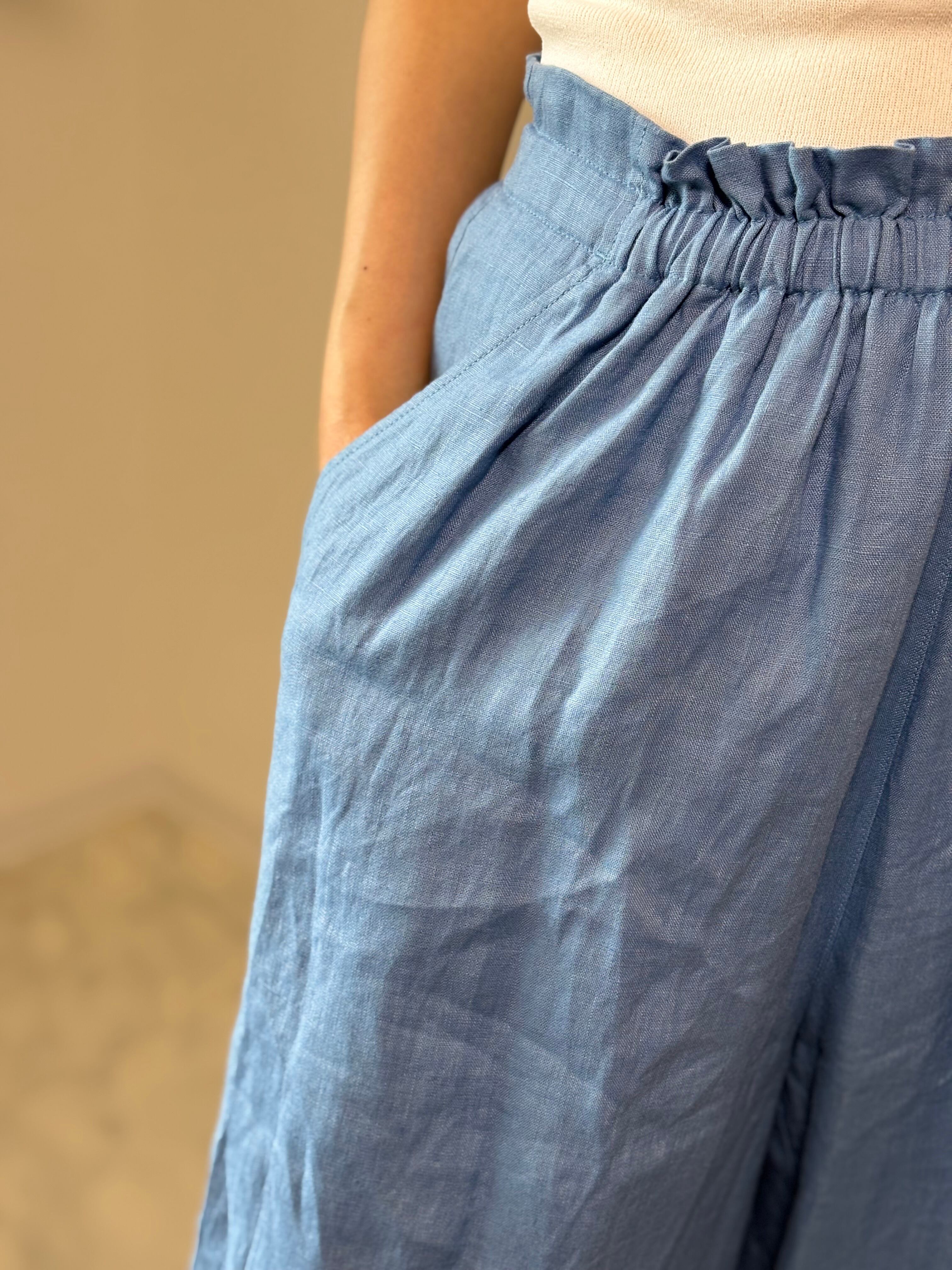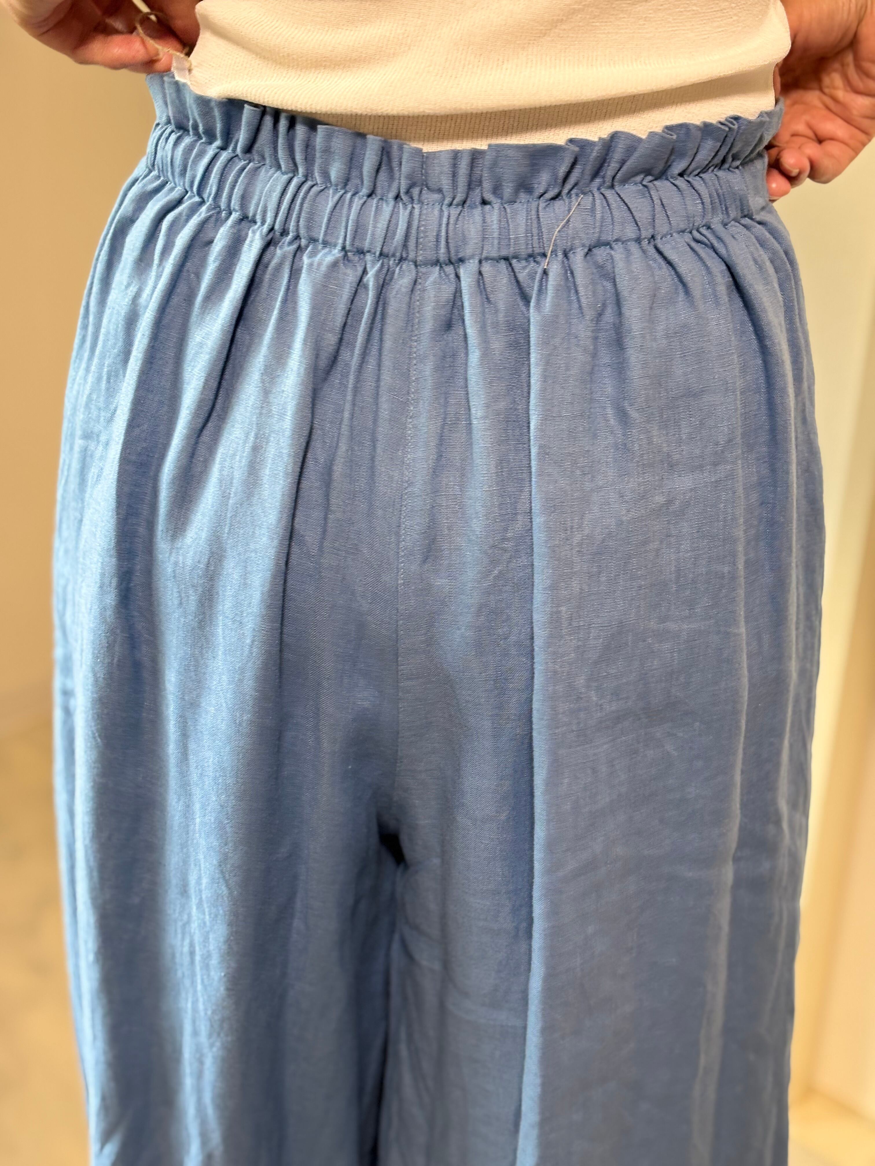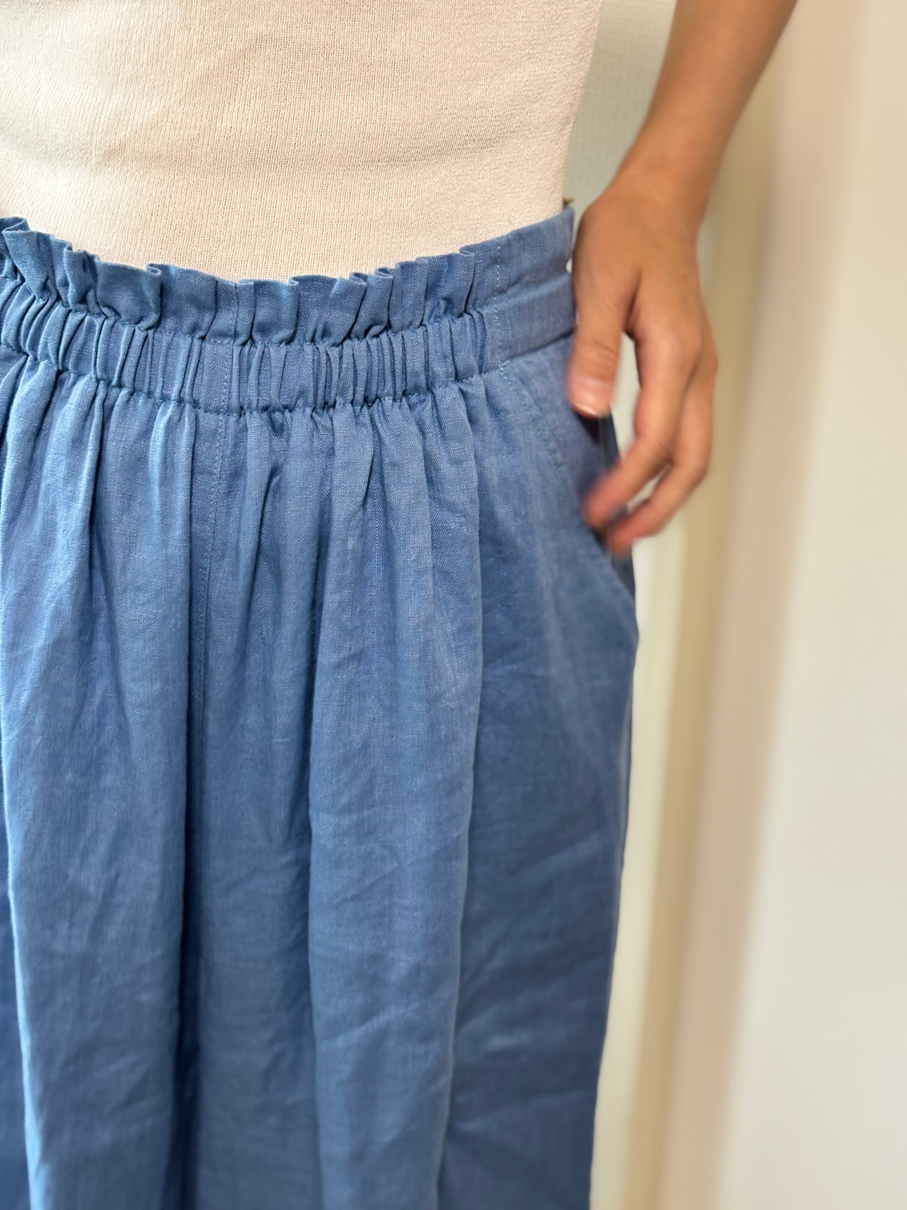 軽やかなリネンを使用したギャザーパンツは、ゆったりとしたシルエットが特徴です。リネン特有の通気性に優れた素材感により、素肌に優しく、暑い季節でも快適にお過ごしいただけます。ギャザーのデザインが、脚のラインを美しく見せ、洗練された印象を与えます。