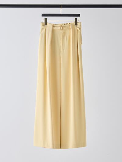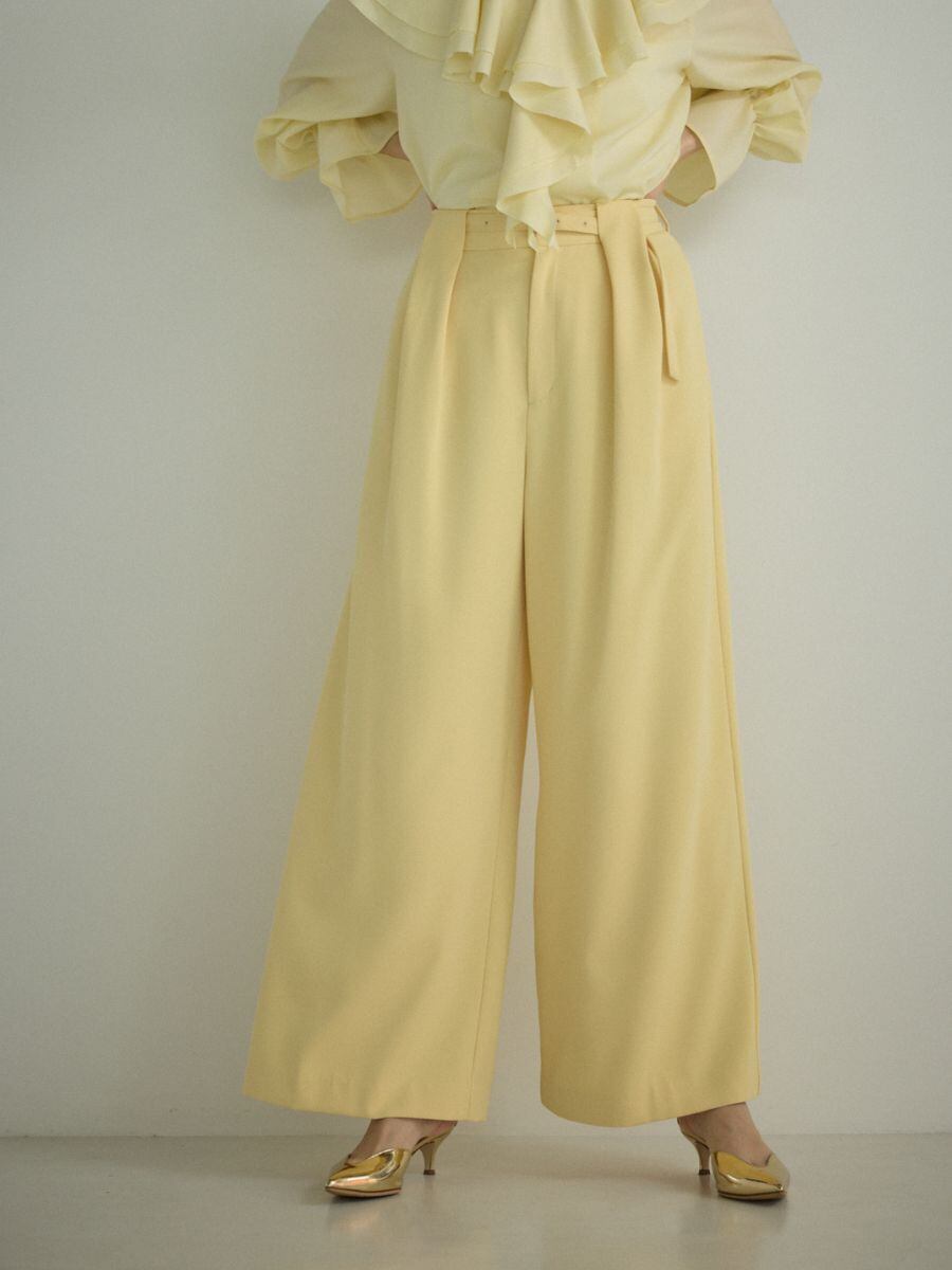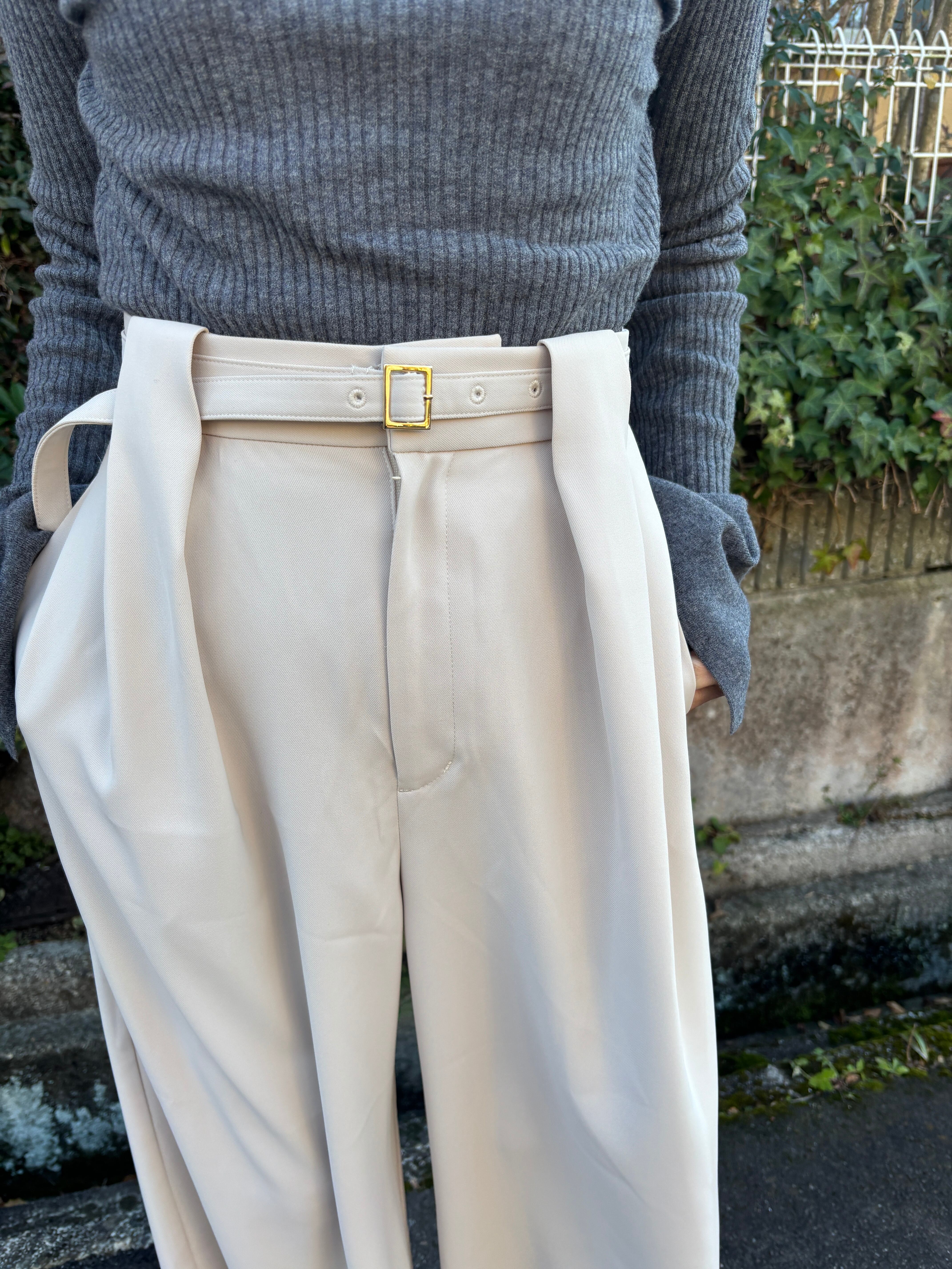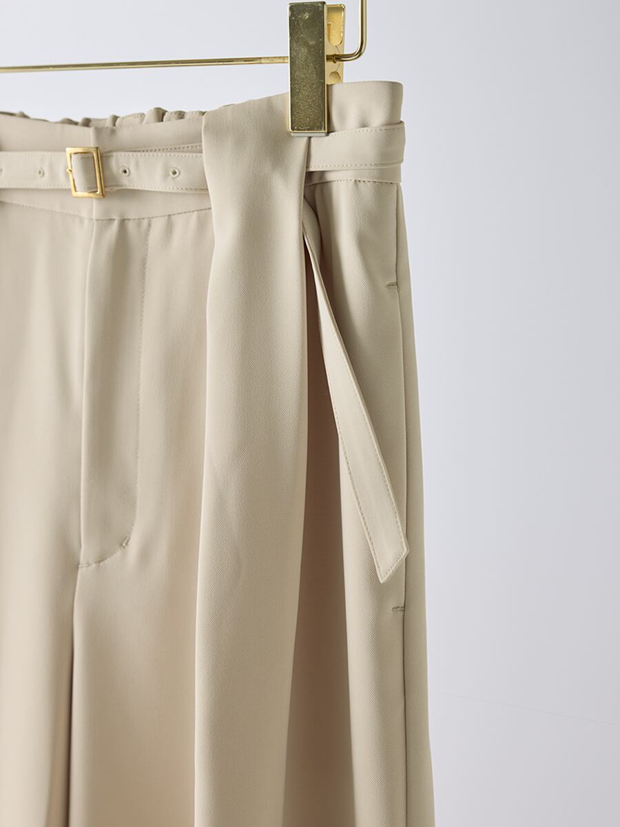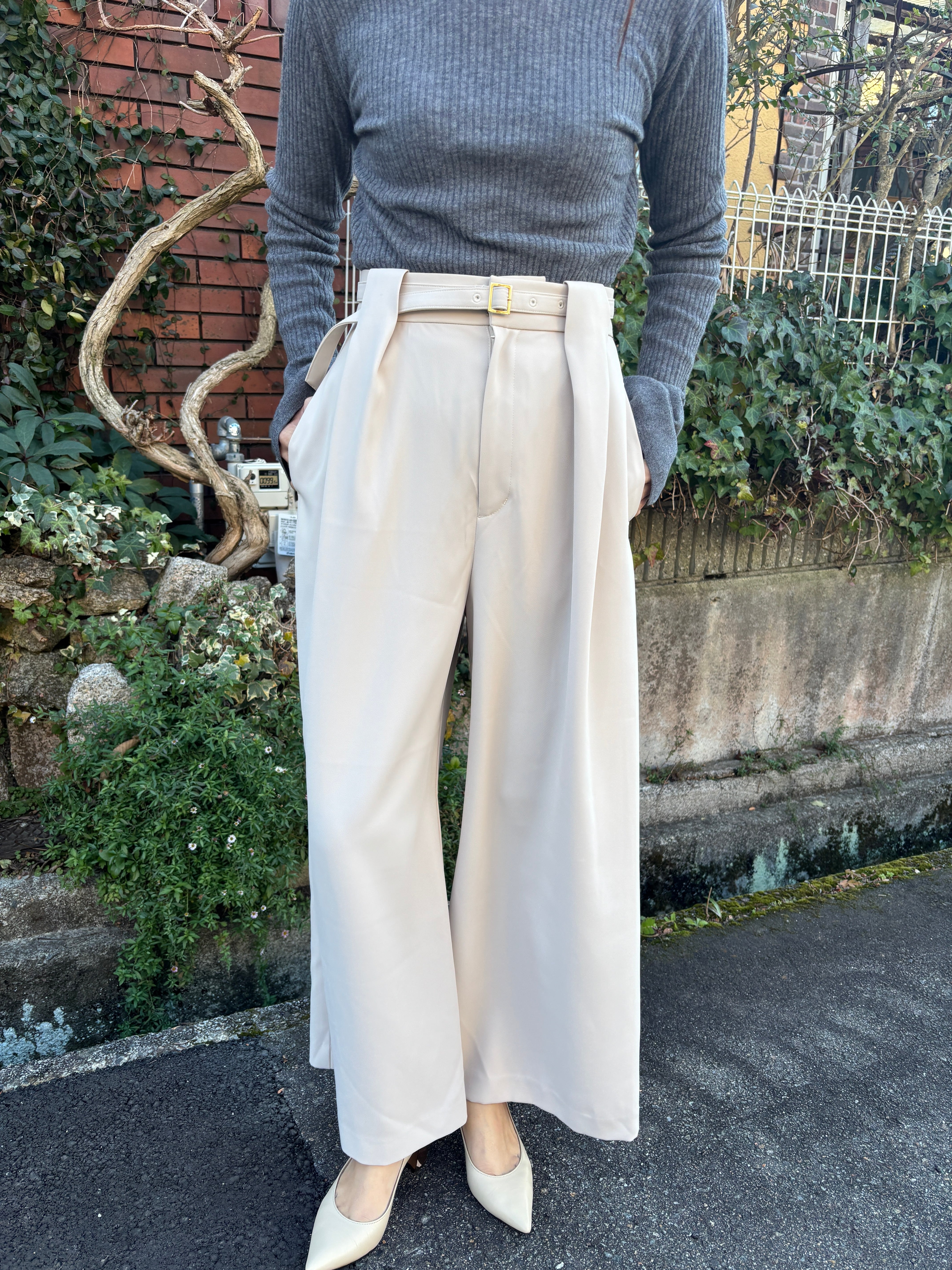 共布ベルトをタック奥に通した立体的なデザインで、シンプルながらも一枚でコーデが決まるワイドパンツ。