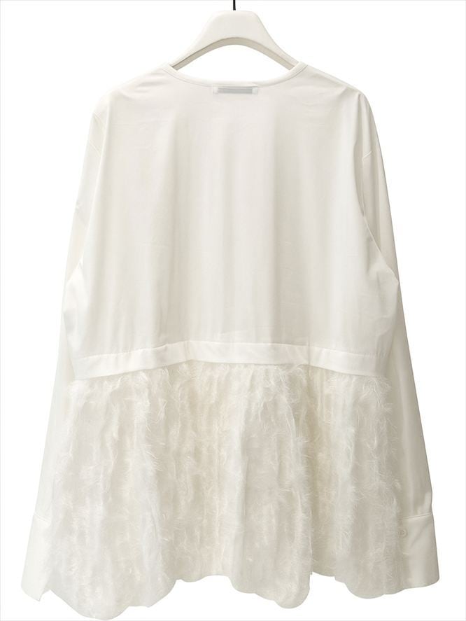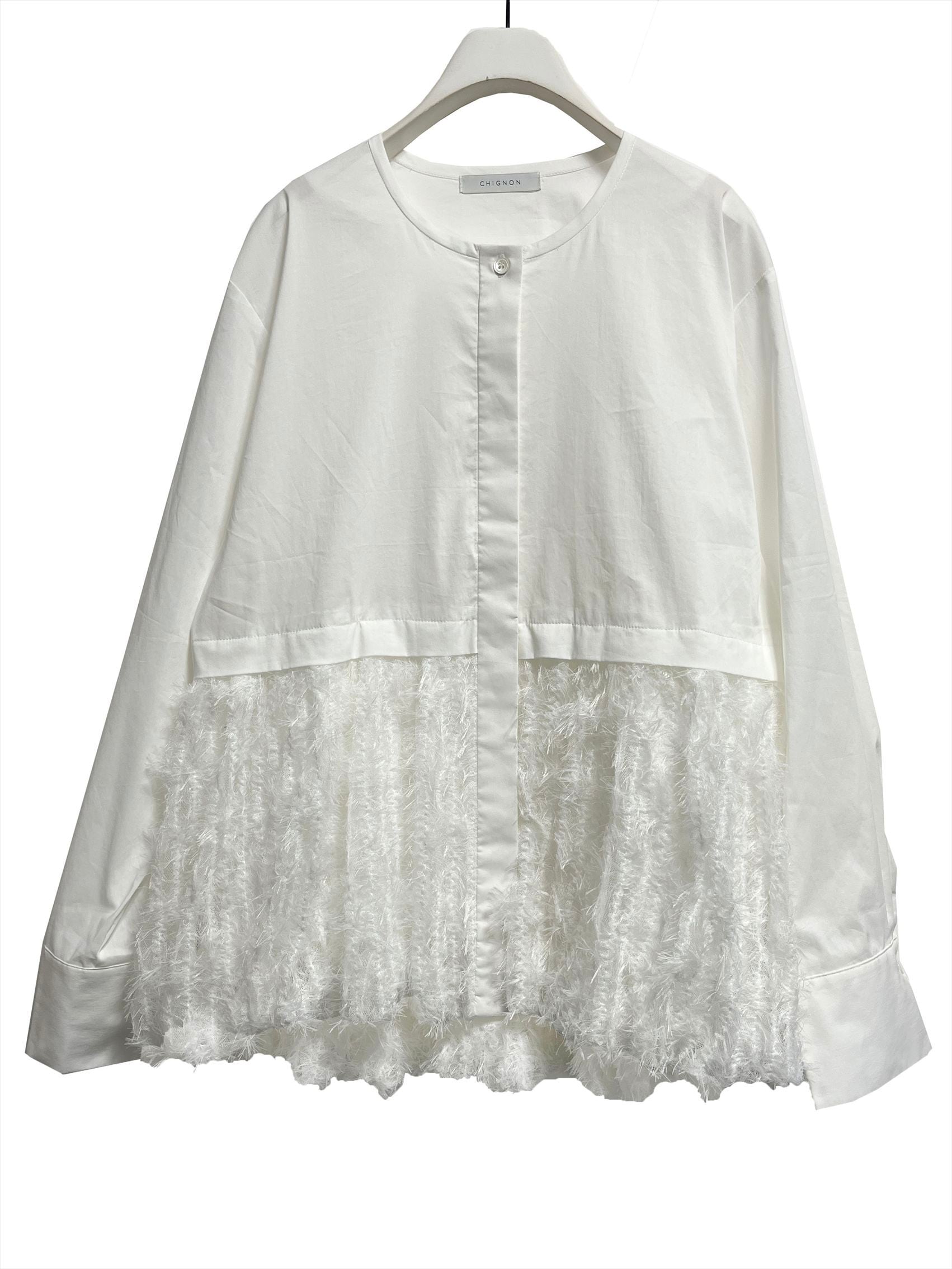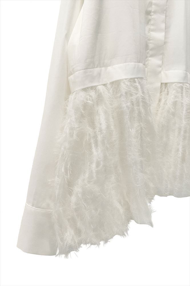 毛足のあるファー素材を裾に切り替えた、華やかなデザインシャツ。