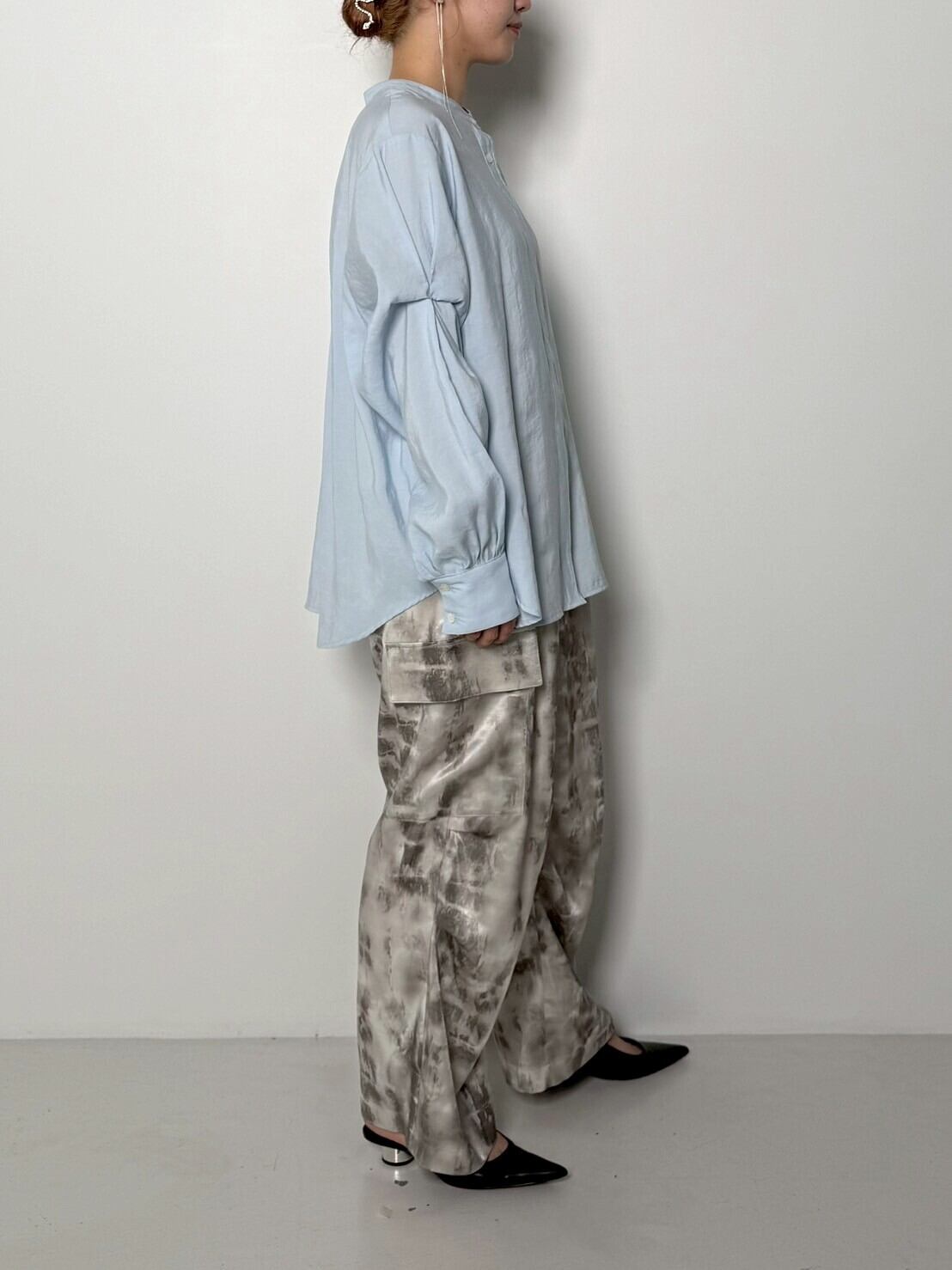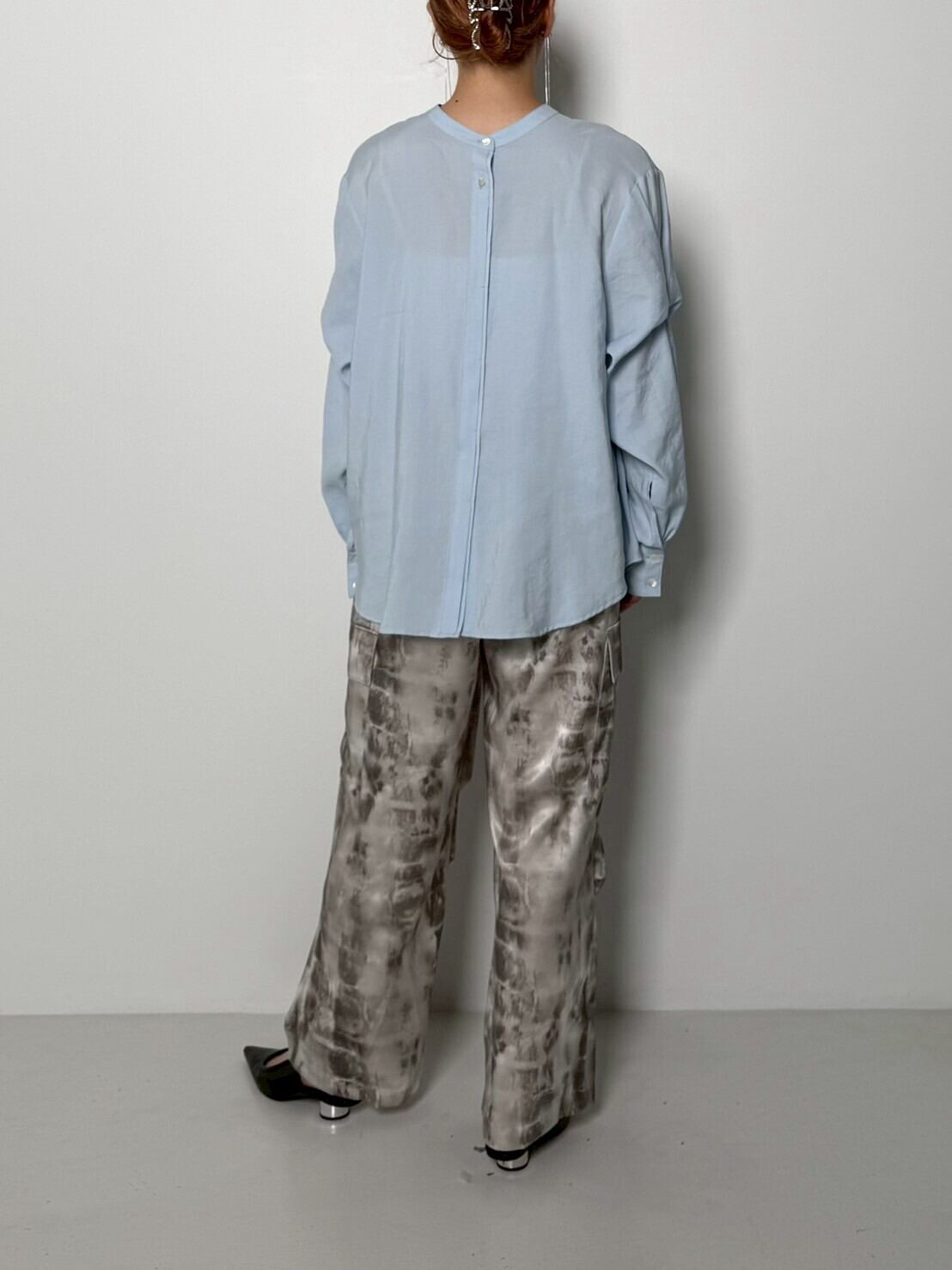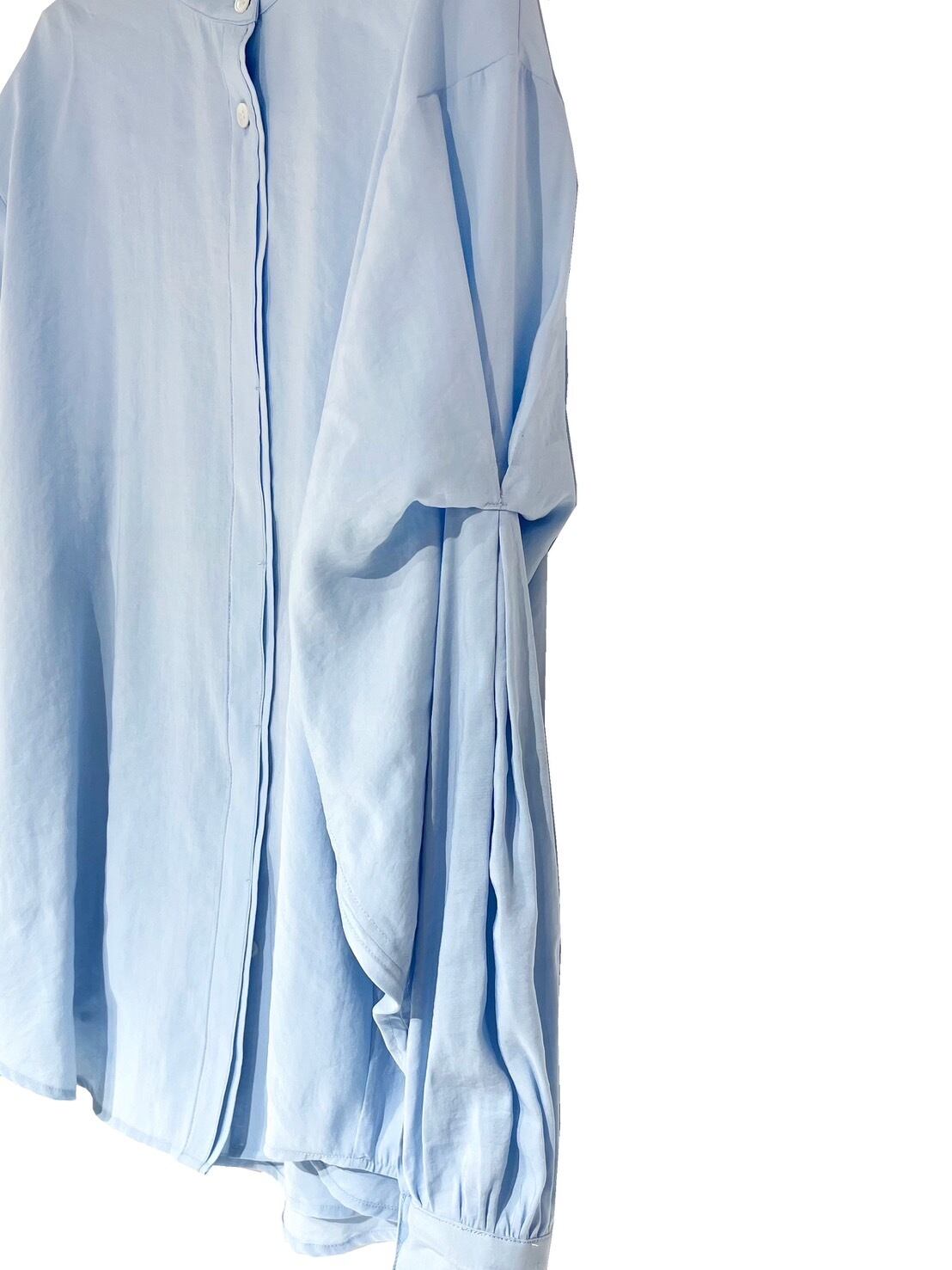 前後どちらを前にしてもご着用して頂ける2WAY仕様で、釦あき側を前にするとすっきりとした比翼、プルオーバー側を前にするとネックにギャザーが施されたフェミニンなデザインになります。全体的にほどよくゆとりのあるシルエットで、ヒップが隠れる着丈なので体型もカバー出来ます。少しピーチスキン調な生地は、柔らかさとハリを併せ持った素材感なので、シャツのシルエットが綺麗に出ます。