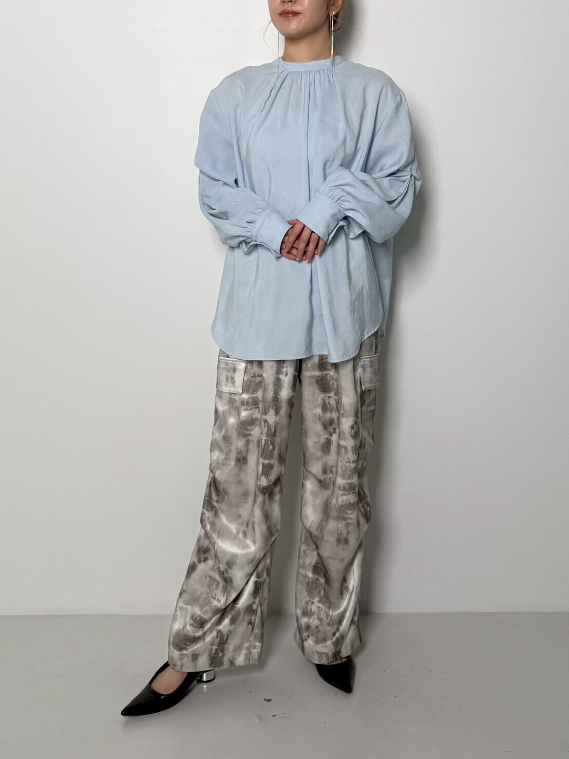 袖のタックやカフス上のギャザーにより、袖まわりがふんわりと膨らむデザインです。
