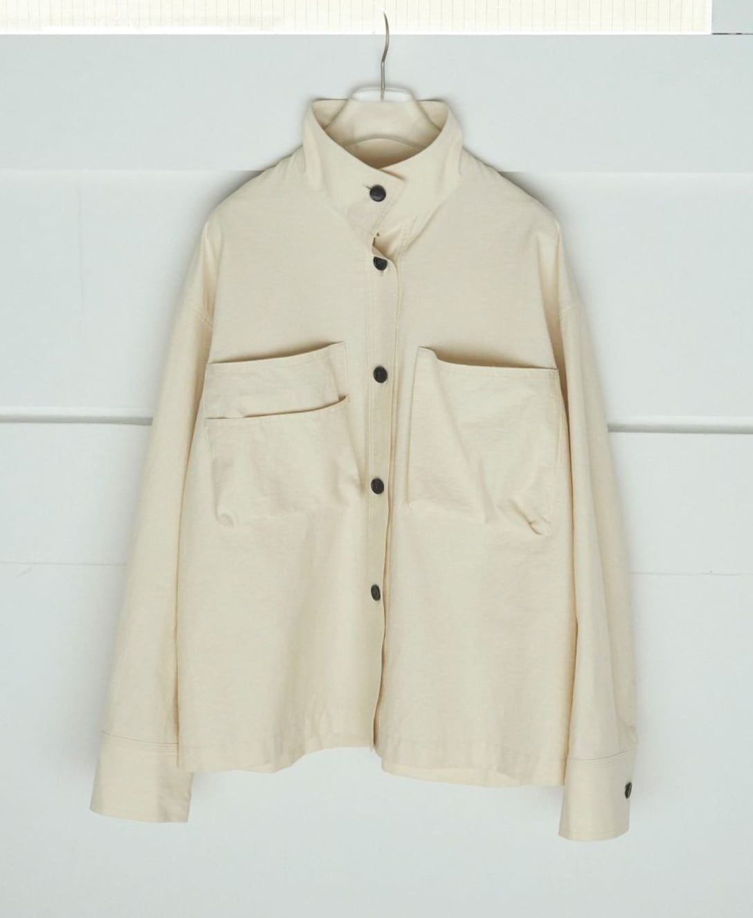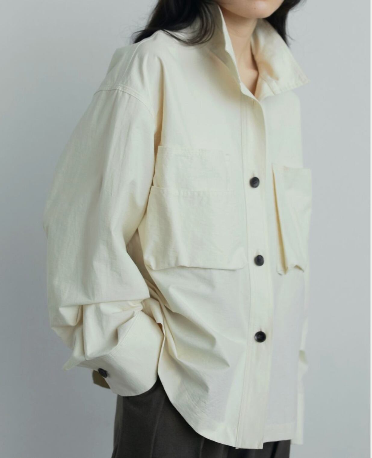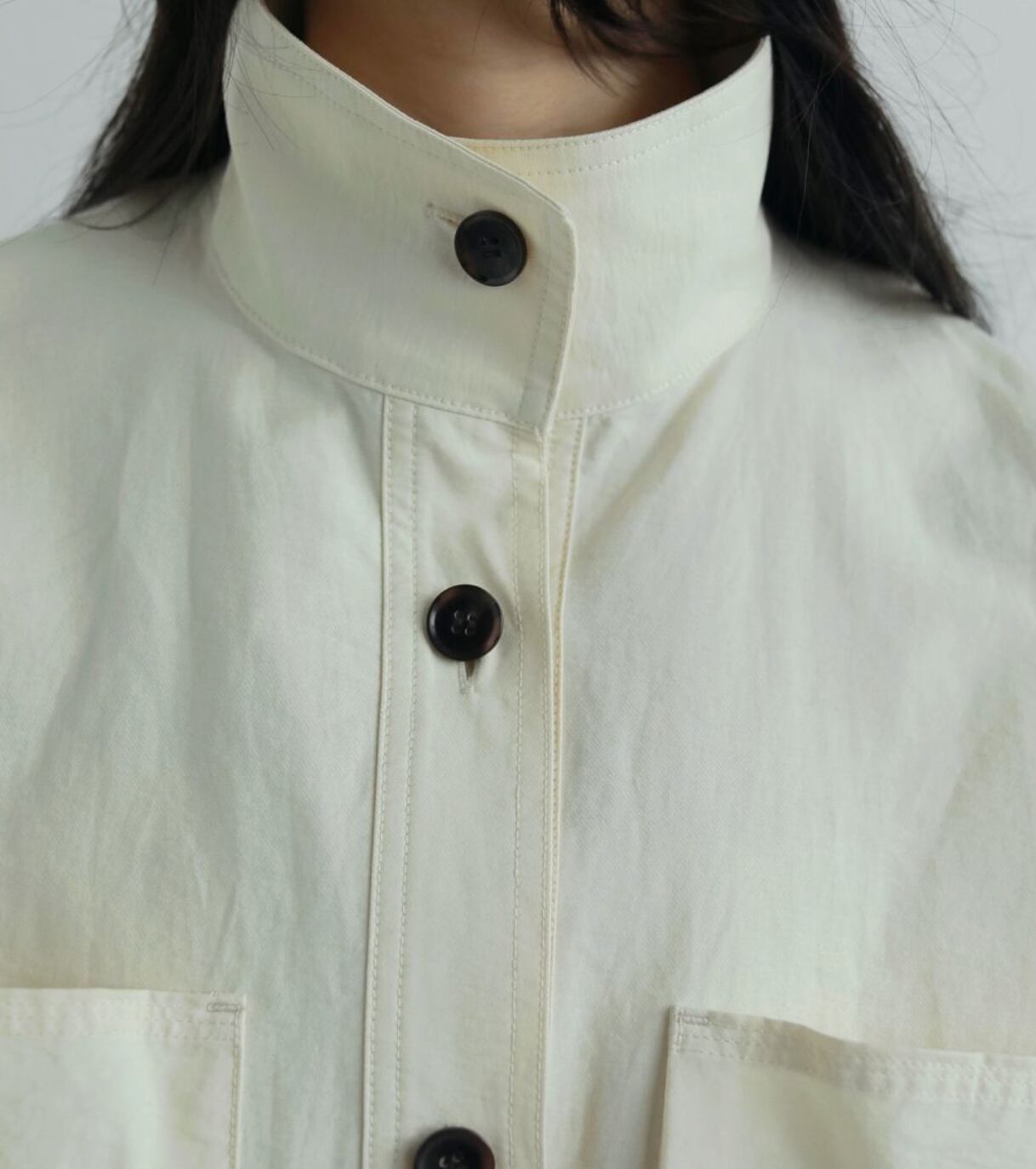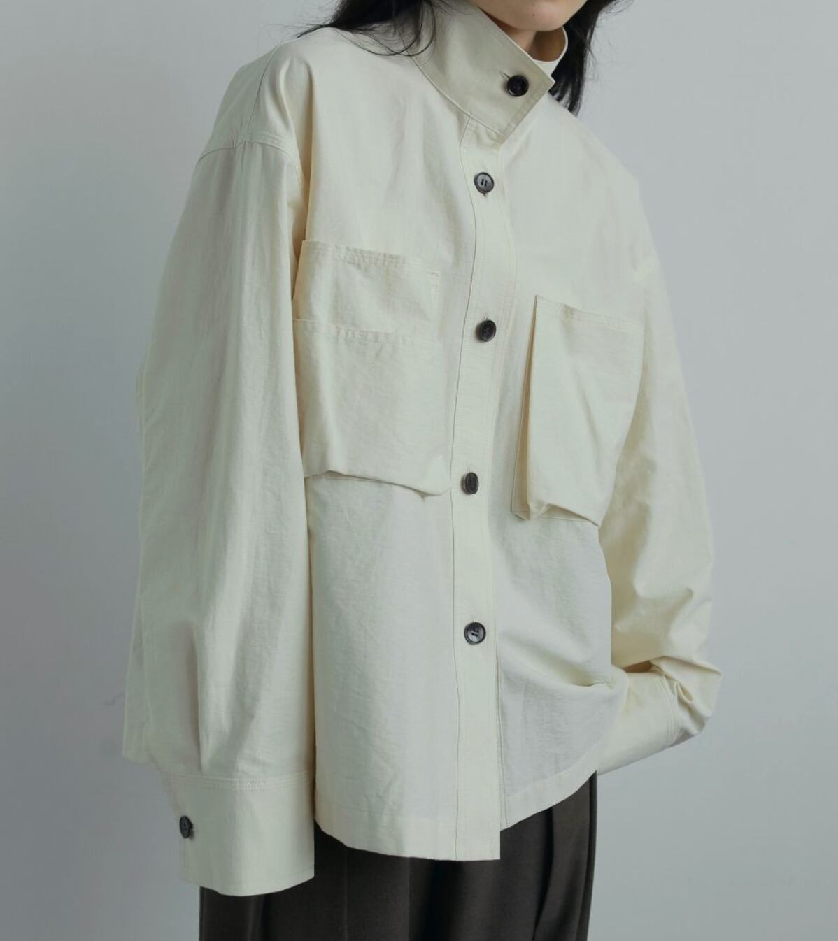 立体的なフロントポケットがポイントのスタンドカラーシャツ。少しハリのある綾目素材を使用しました。軽めの羽織としてもおすすめです。ボタンを全部閉じるとモードな印象に。上を開けて首元を見せると、抜け感がありこなれた印象に。大きめのフロントボタンで、アイボリーは配色ボタンがスタイリングのアクセントになります。シンプルなボトムに合わせるだけで、ニュアンスの出る一枚です。