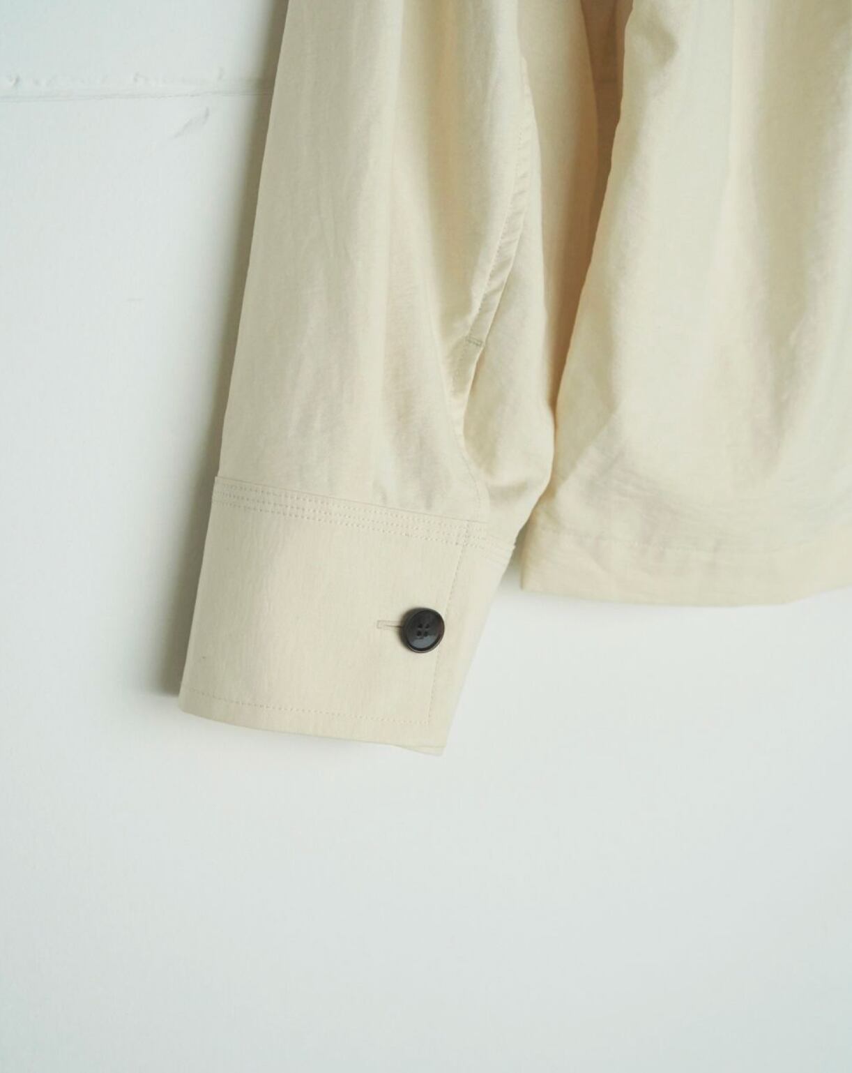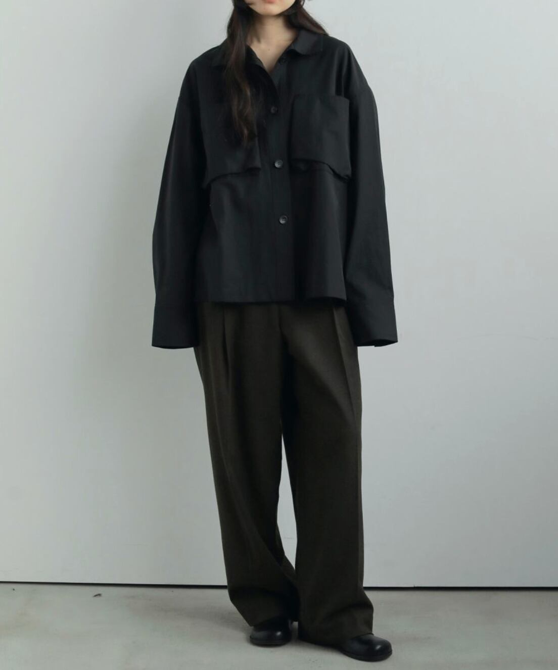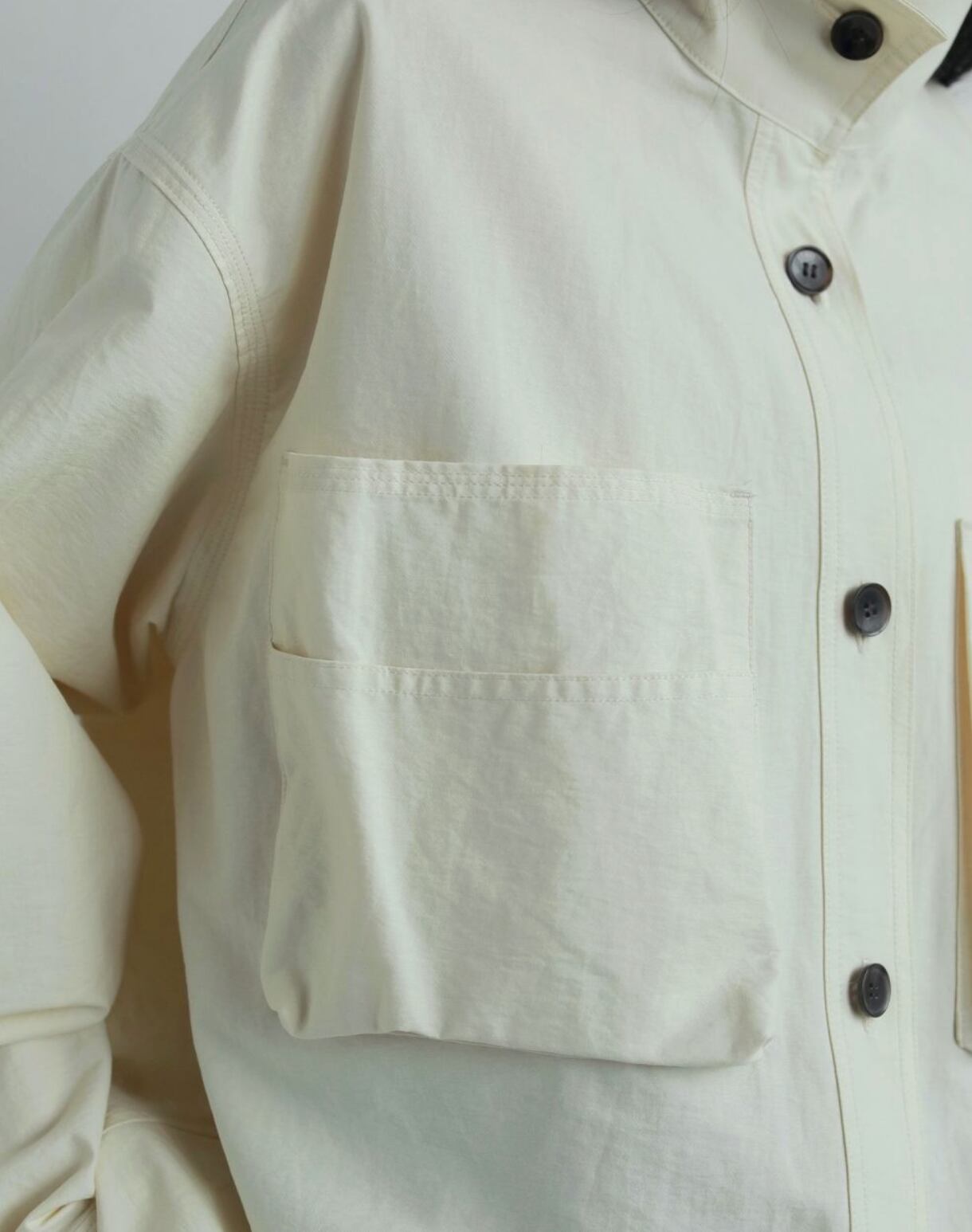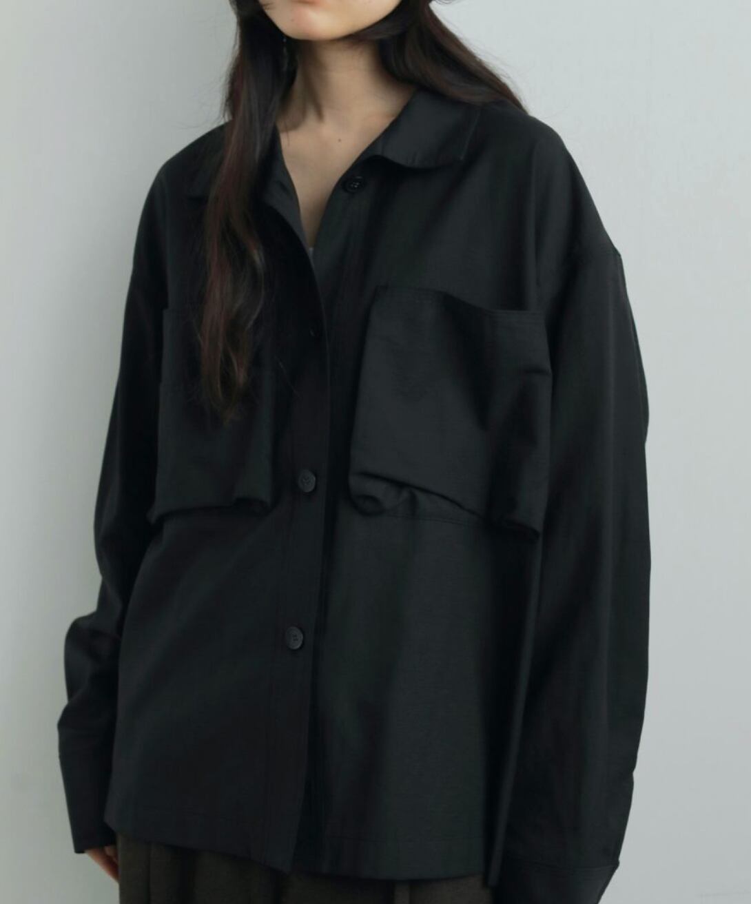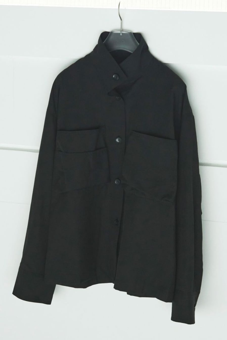 立体的なフロントポケットがポイントのスタンドカラーシャツ。少しハリのある綾目素材を使用しました。軽めの羽織としてもおすすめです。ボタンを全部閉じるとモードな印象に。上を開けて首元を見せると、抜け感がありこなれた印象に。大きめのフロントボタンで、アイボリーは配色ボタンがスタイリングのアクセントになります。シンプルなボトムに合わせるだけで、ニュアンスの出る一枚です。