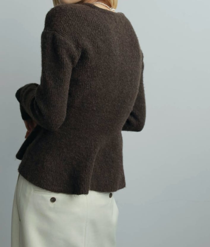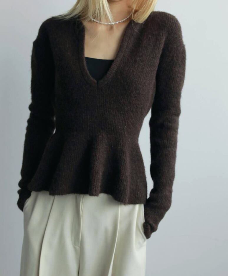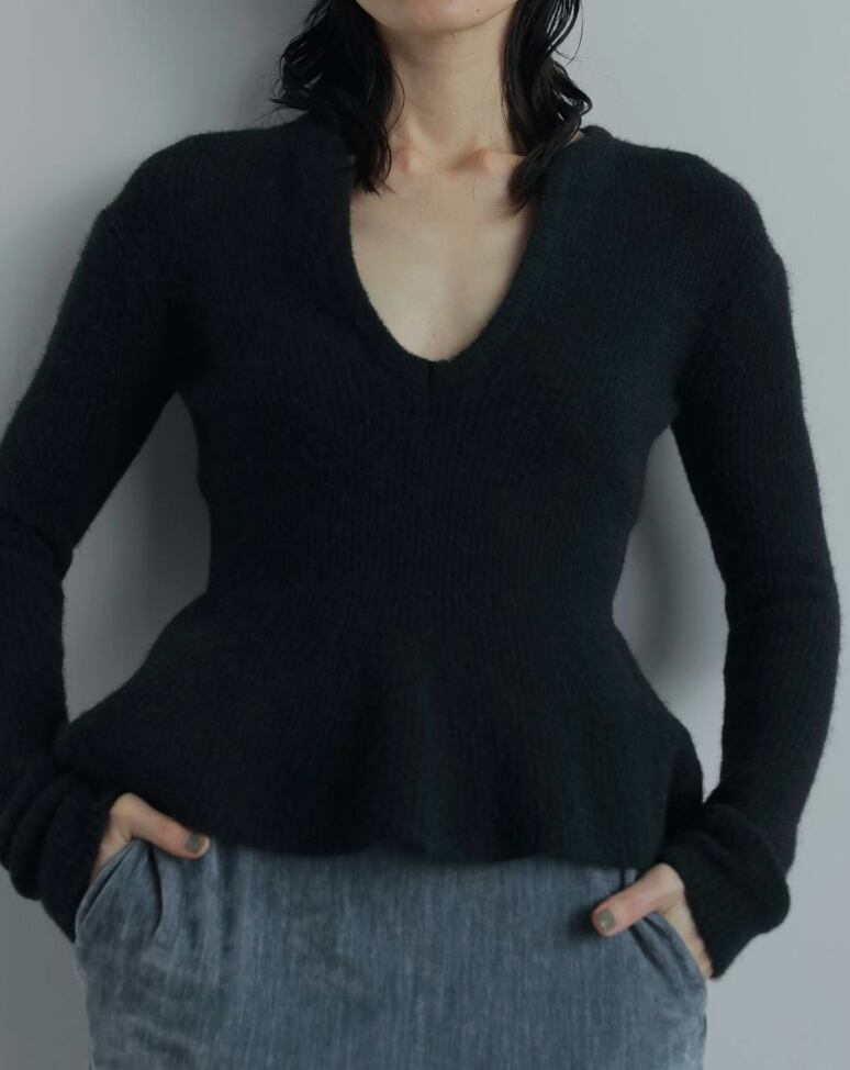 ぺプラムデザインと深めのスキッパーあきが女性らしいニットトップス。柔らかく温かみのある風合いで、モードなフォルムを出しながら、優しい印象で着ていただけます。アウターの中にも着やすい程良い厚みで、スタイリングに映える一着。コンパクトなタートルトップスなどを重ねたり、アクセサリー使いで、首元のレイヤードも楽しめます。