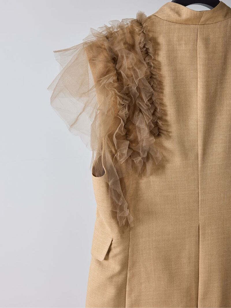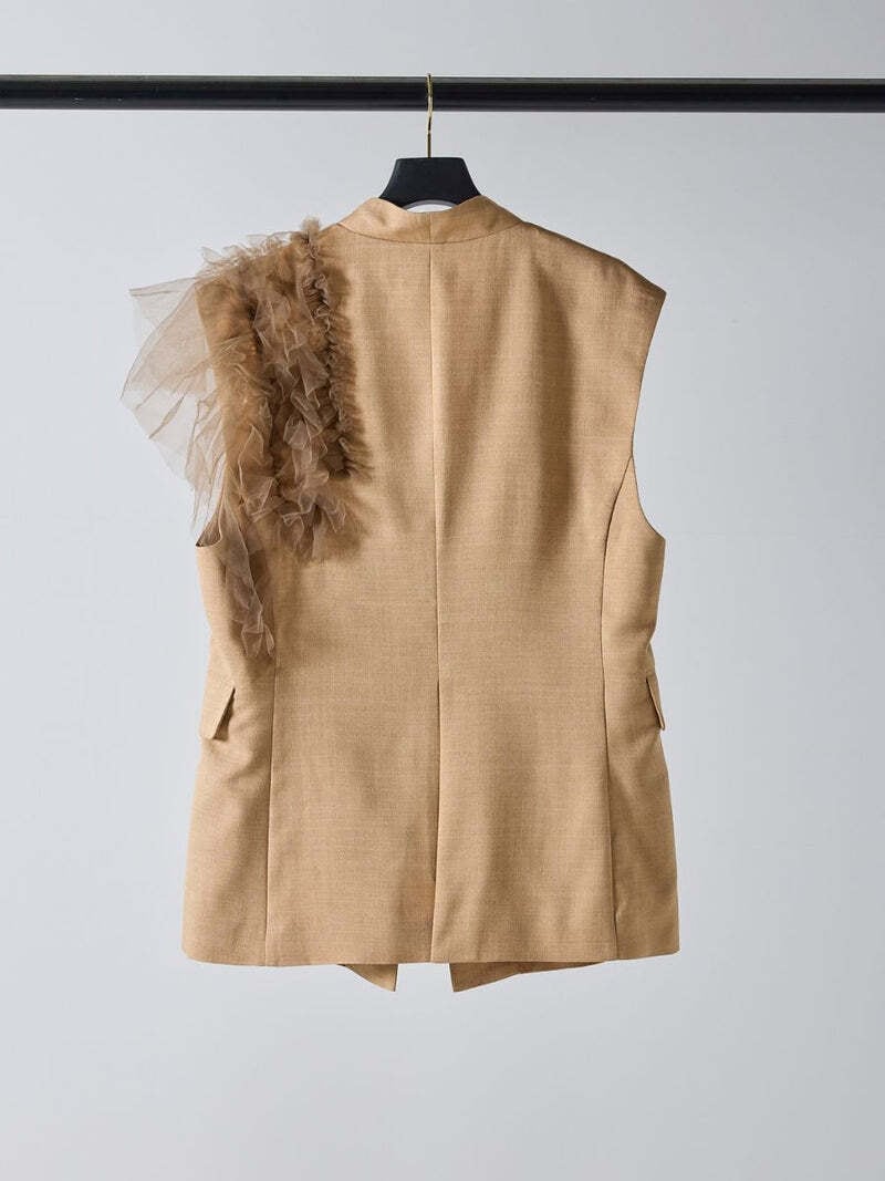 衿が首に沿うように設計されたきちんと感あふれるベストに、アシンメトリーに大胆にあしらわれたチュールフリルが目を引く一着。