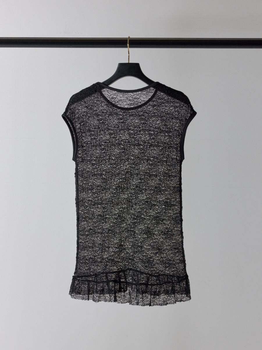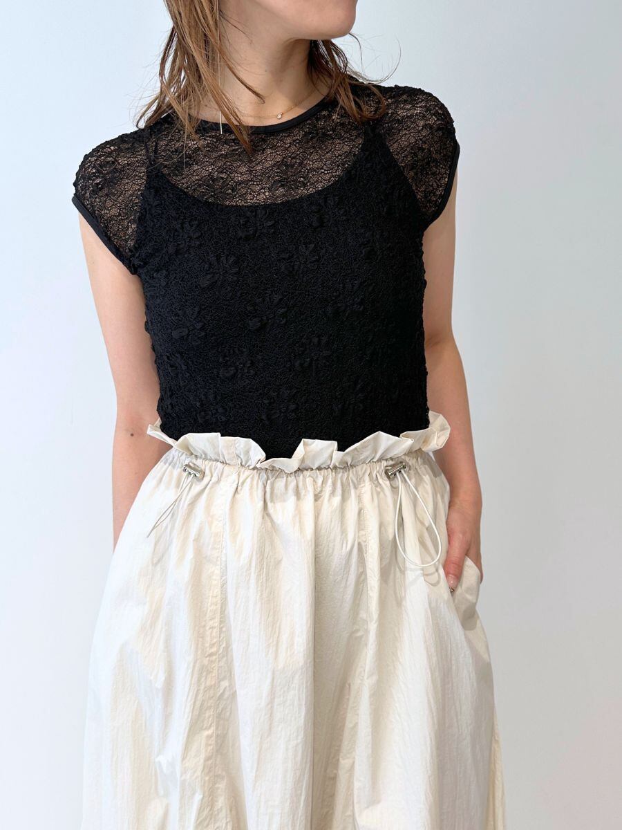 「一枚で着られる、レースタンクという選択。」Mewlで大人気の柔らかなストレッチレースTOPSが、夏に頼れるタンクトップにアップデート。腕まわりをきれいに見せるパターンで、気になる二の腕や腕下をさりげなくカバーします。一枚でも映えるよう、裾には品のいいフリルをプラス。インナーとしても、主役としても活躍する、夏のワードローブに欠かせない一着です。