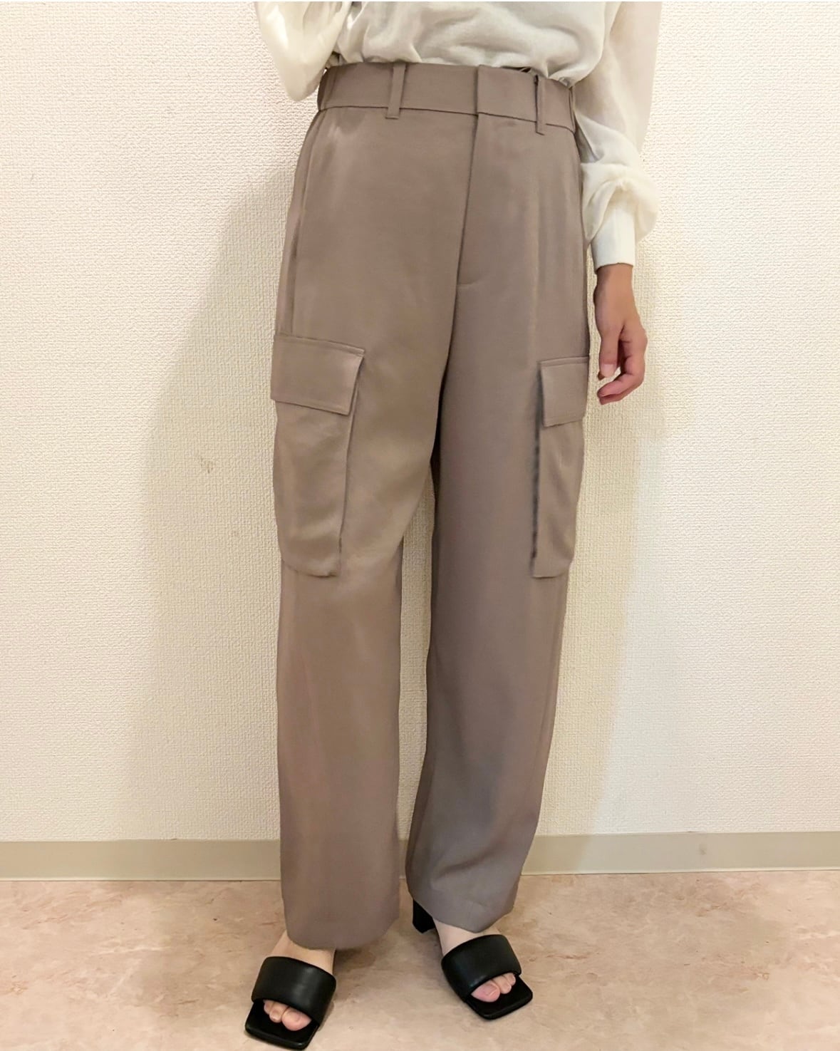 洗練された印象を与えるカフネのサテンカーゴパンツ
