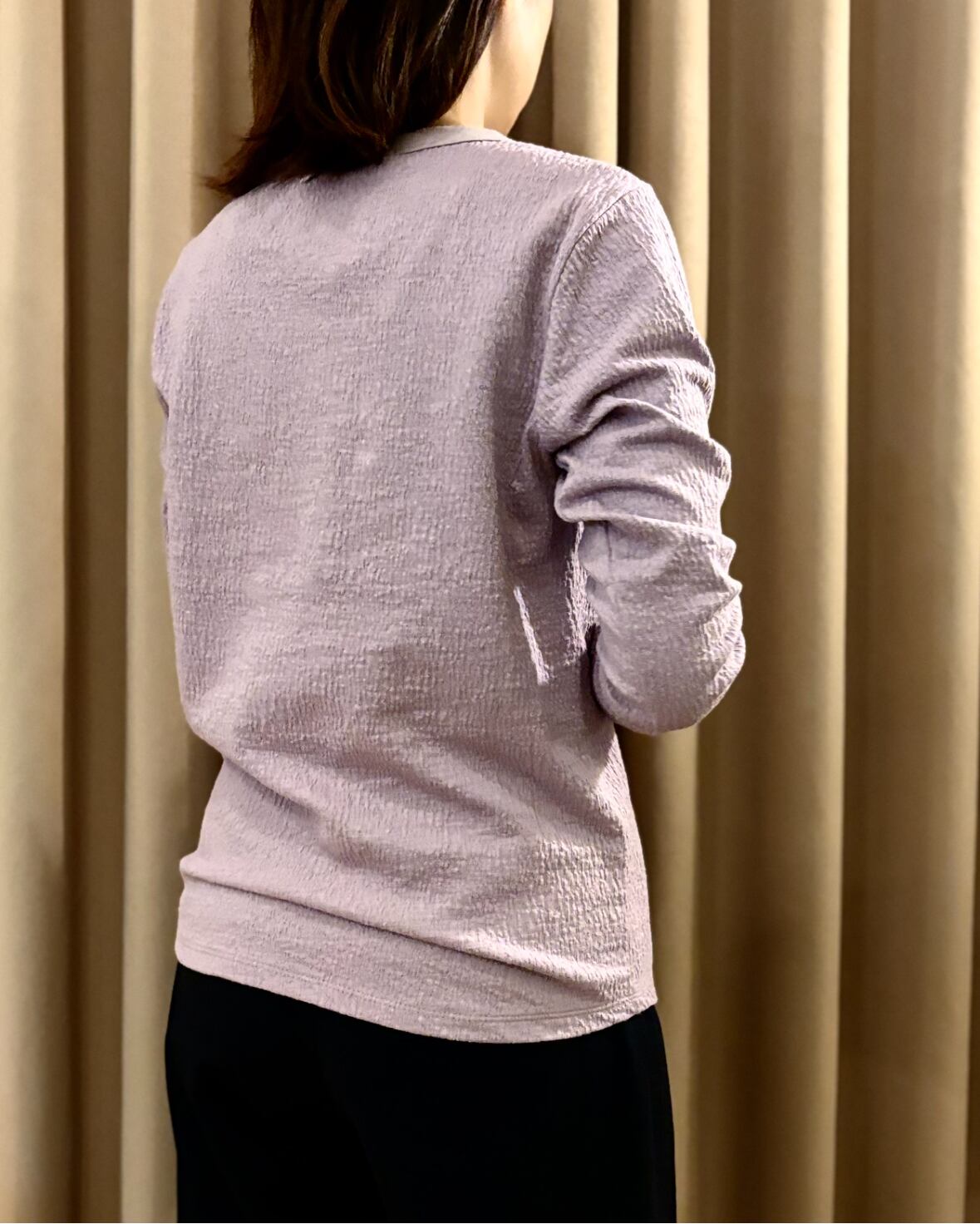 このルメランジュのコットンシャーリングジャガードは、ポコポコとしたシャーリングニットジャガードが特徴で、コットンのソフトバンクな肌触りが魅力です!シンプルで合わせやすいデザインなので、日常使いからお出かけまで幅広くご活用いただける一着となっております。