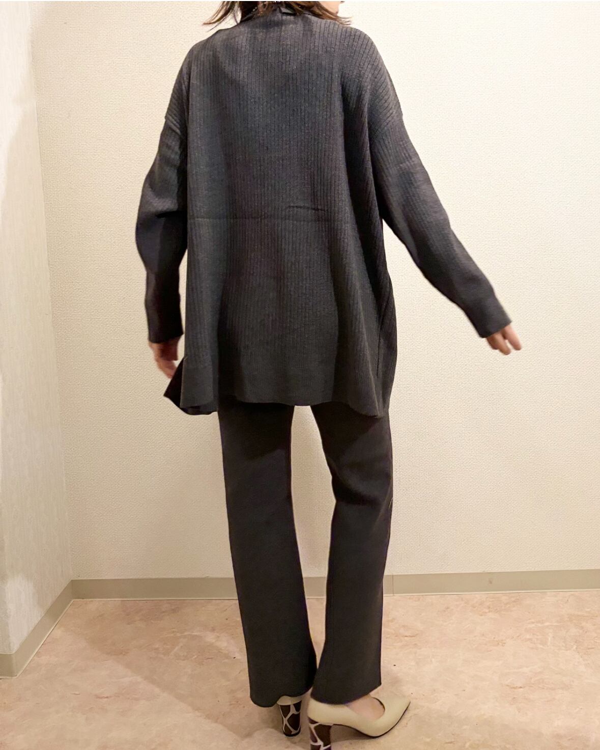 同素材のアシメスリットリブオーバータートルとセットアップで着用でき、コーデに迷うことなく洗練された装いに。